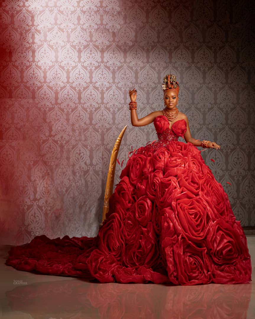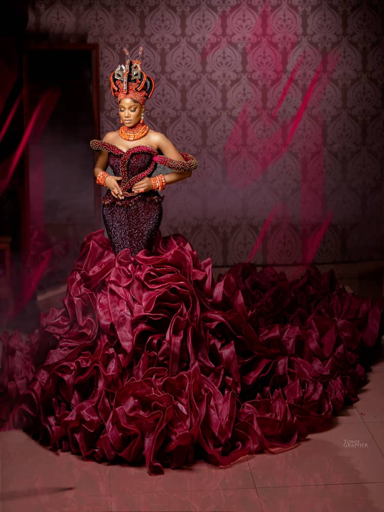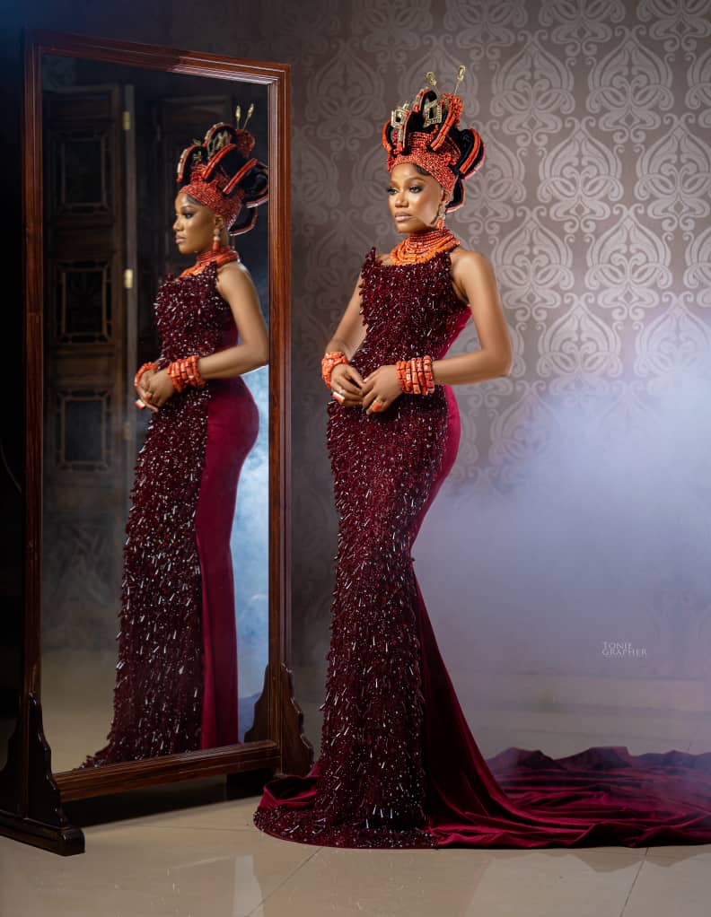 Each outfit in the Queen Idia collection is styled with coral beads, headpieces, and royal-inspired details that reflect the heritage of the Benin Kingdom. These touches are not just for decoration—they tell the story of a people known for their wealth, tradition, and creativity.