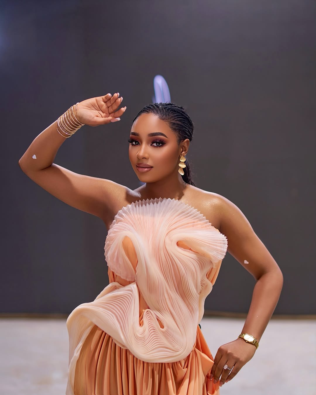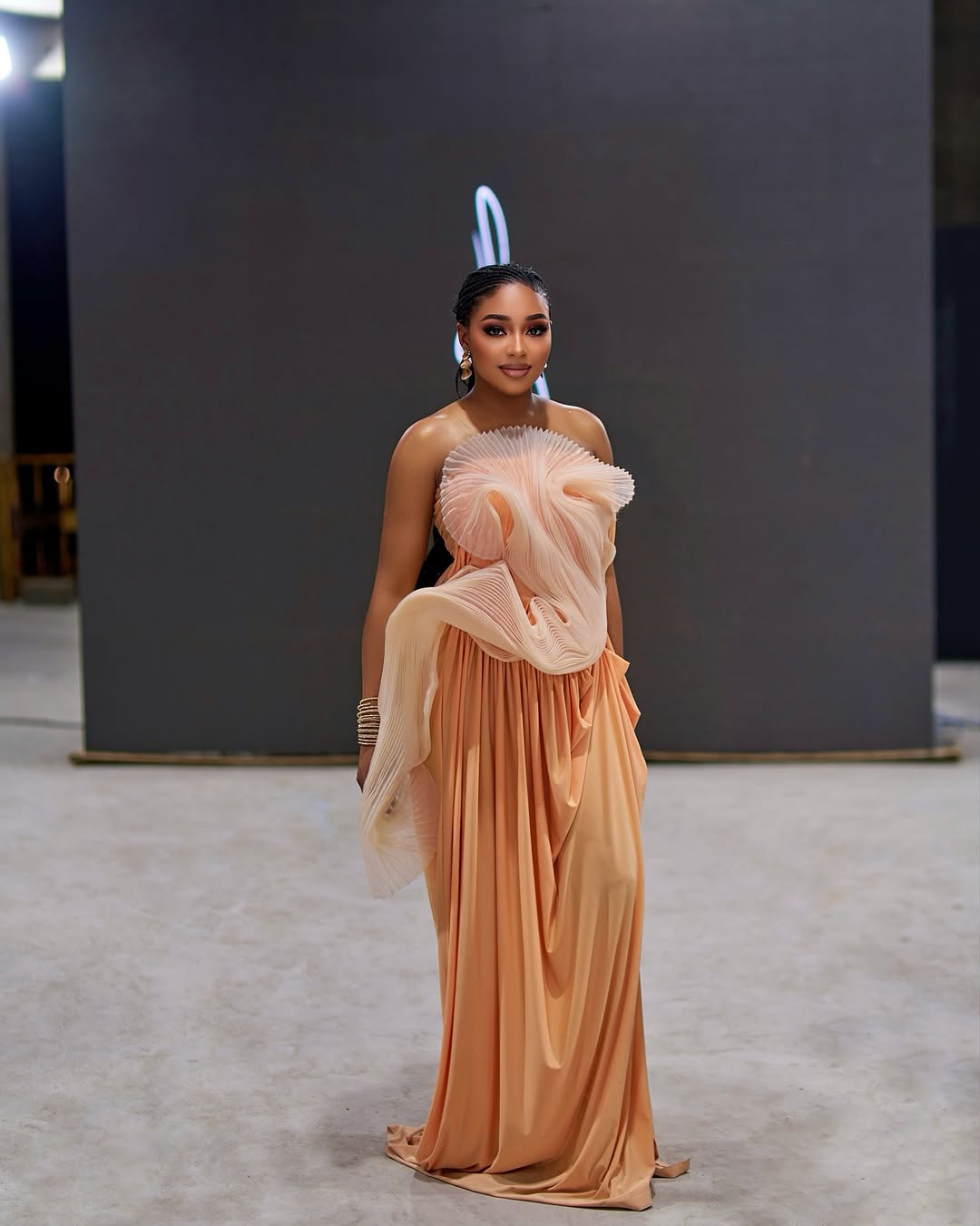 Kiky’s look was pure drama, in the most elegant way possible. Her gown, sculpted in shades of peach and blush pink, was a living piece of architecture — pleats twisting across her torso and unfurling outward like origami in motion. Each fold caught the light just right, a reminder that structure can be sensual when done with intention.