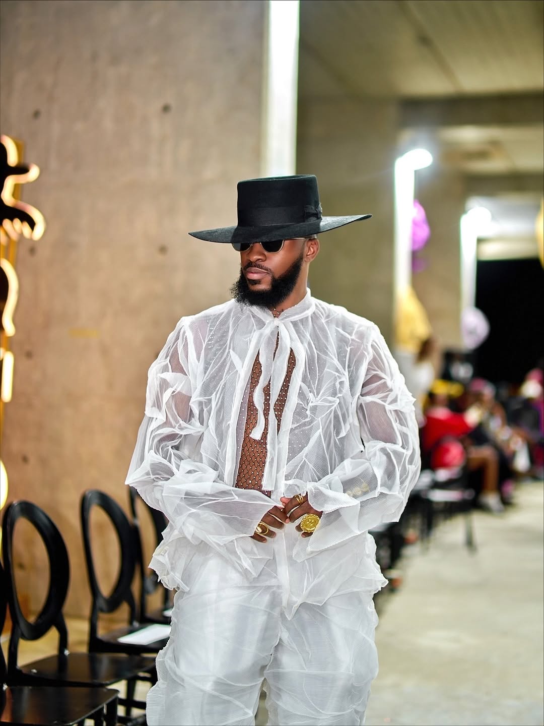Beside her, Akin reminded everyone that menswear doesn’t play second fiddle anymore. His sheer white trousers paired with a crinkled jacket blurred the line between traditional tailoring and avant-garde ease. A brown patterned panel anchored the look, while a wide-brimmed hat and dark sunglasses sealed his signature edge.