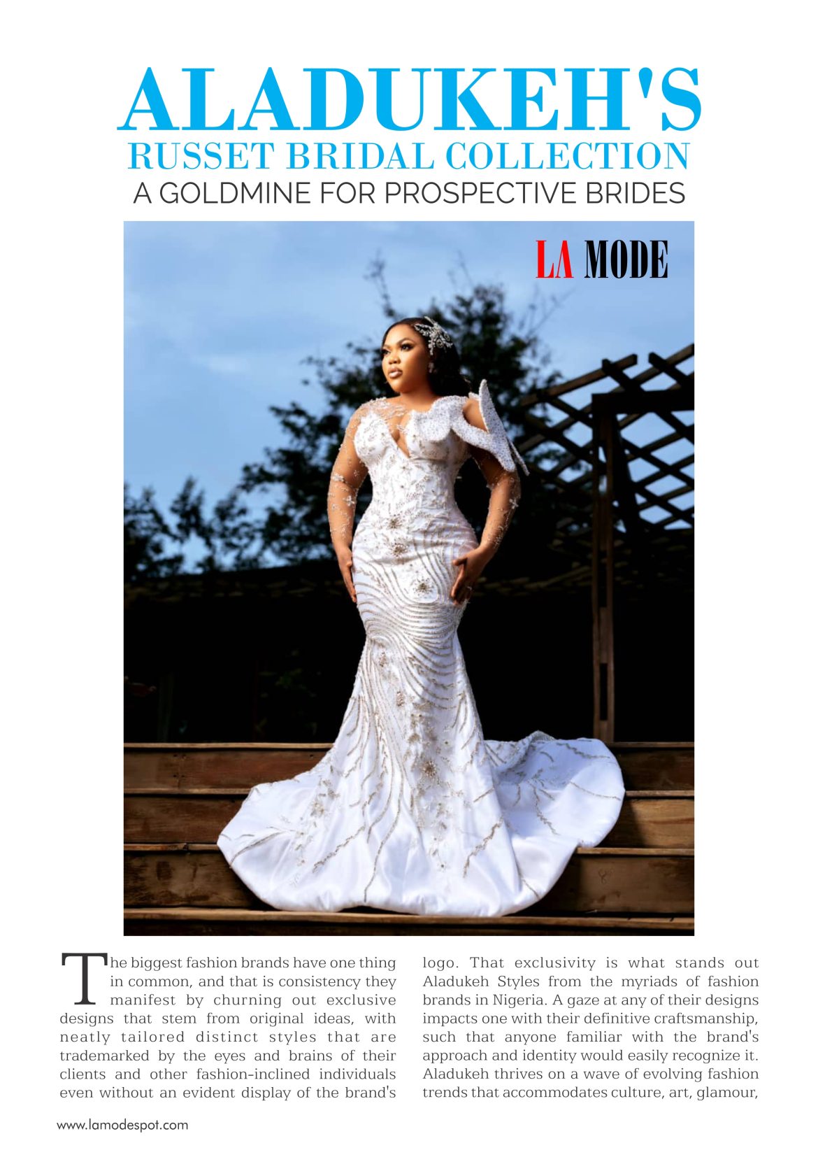 On the 20th of July 2023, Aladukeh held a fashion show to launch their latest collection – Russet Bridal Collection. It was an event that hosted the most relevant fashion personalities in Nigeria and had celebrities like Eniola Ajao as a runway model amidst other guest celebrities. It was a confluence of tradition and creativity. The collection displayed adequately what it means for a woman to embody the splendor that comes from being wedded. Over a dozen designs were stitched, perfected, and styled to feature a fusion of African attires elevated by the western fashion culture and vice versa. It was evident that the process of creating the designs were intentional. The choice of fabrics, patterns, colours, designs, and tailoring method for each aligned to form garments that echoed royalty, longevity, and quality.
