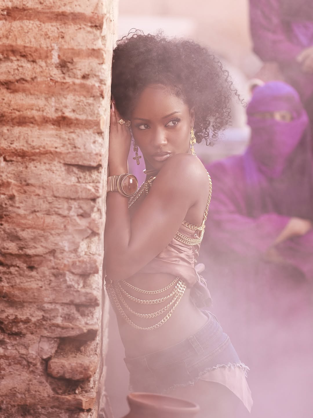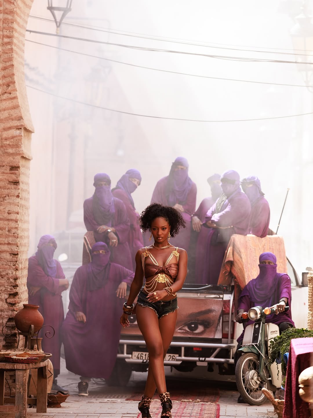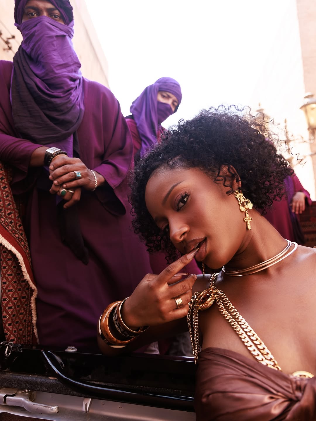 In one shot, Ayra channels what can only be described as desert royalty — all bronzed tones and unapologetic power. A strapless brown top with ruched detailing, gold jewellery stacked like armour, and hair that frames her face with the kind of volume that feels both wild and intentional. Around her, a troupe in deep purple robes move like part of an ancient ritual, grounding the scene in mystery and heritage.