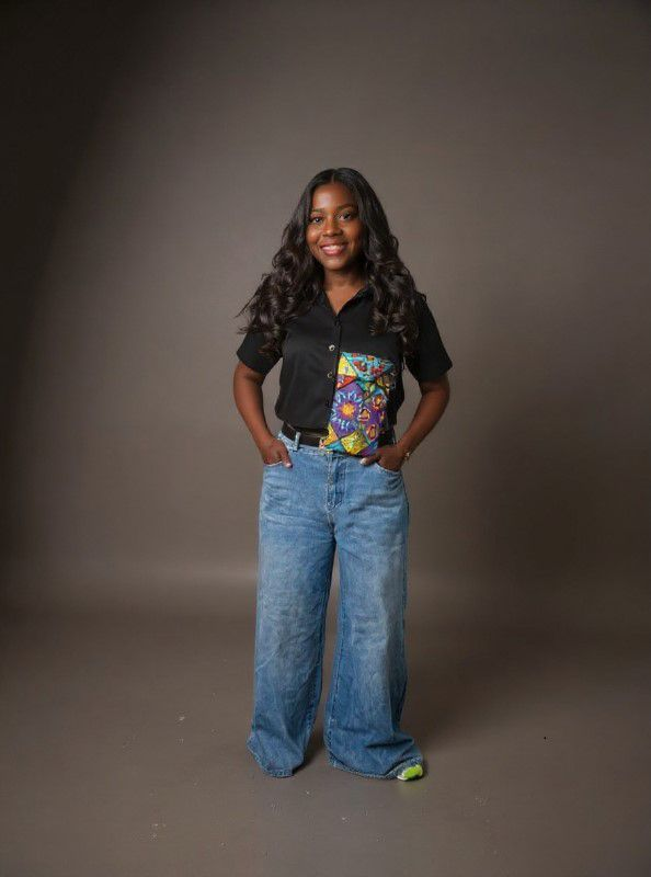This look photographs exceptionally well: the panel reads from 10 meters, the denim gives motion, and the black grounds the frame. On street style grids, it will register as joyful rather than loud, exactly the sweet spot for global audiences who want connection to West African textiles without costume.