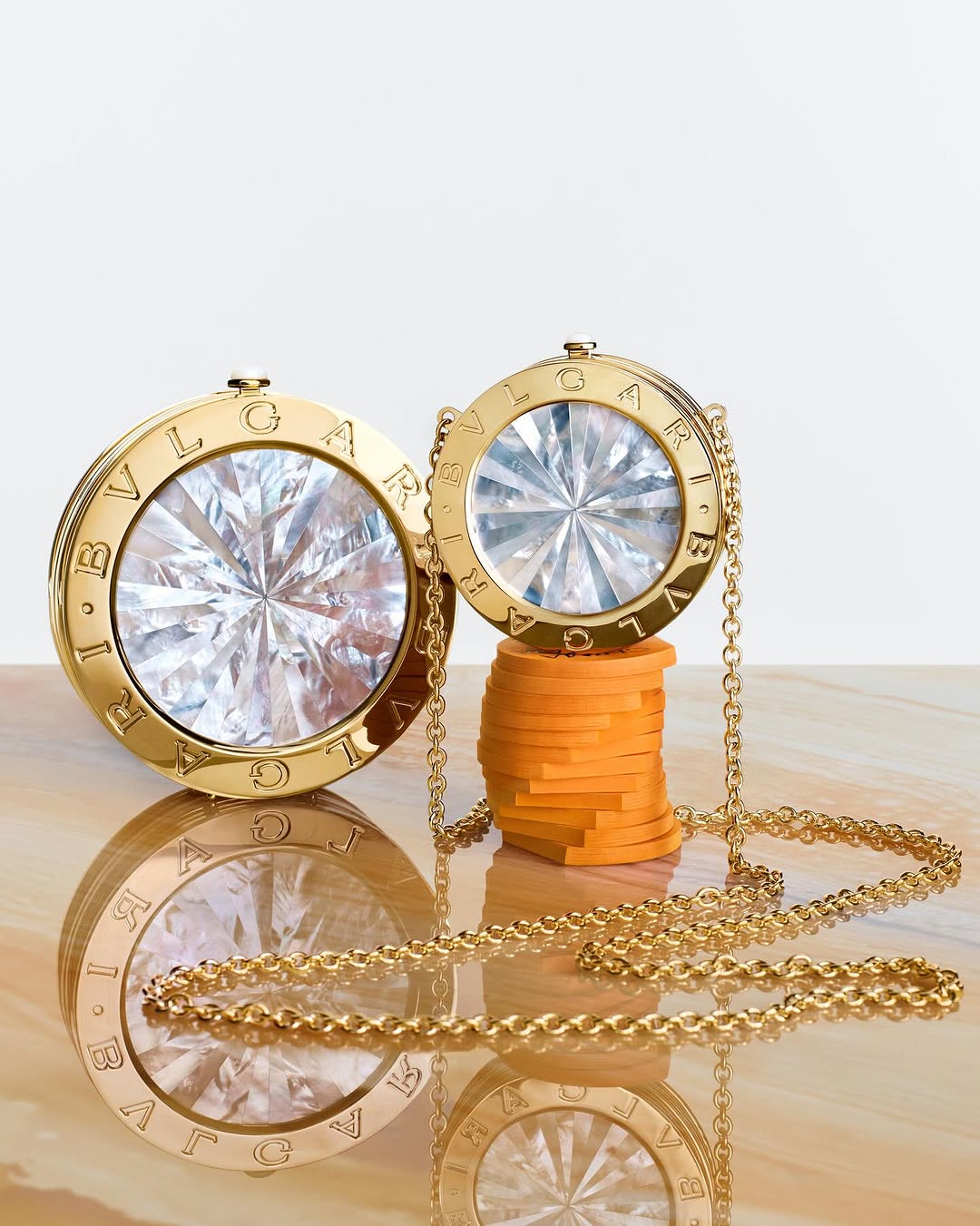 Beside her rests one of the collection’s defining pieces: a sculptural circular gold clutch from the Icons Minaudière line. Designed by Katrantzou, the piece draws inspiration from the classic Bvlgari Bvlgari motif, finished with a luminous mother-of-pearl face and engraved gold rim.