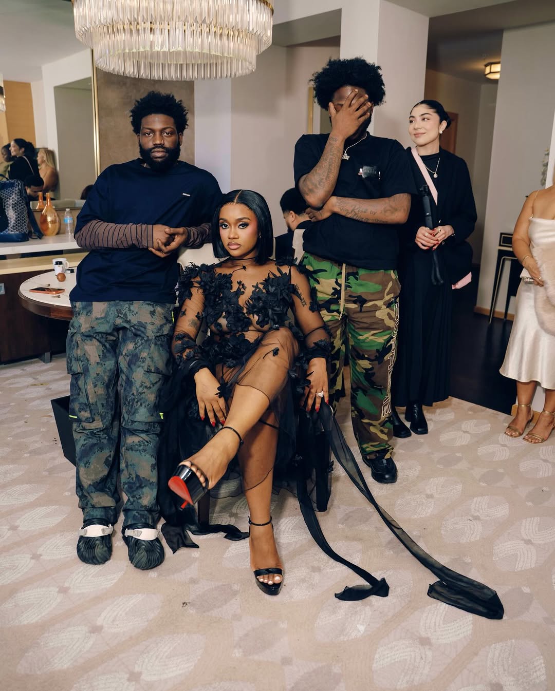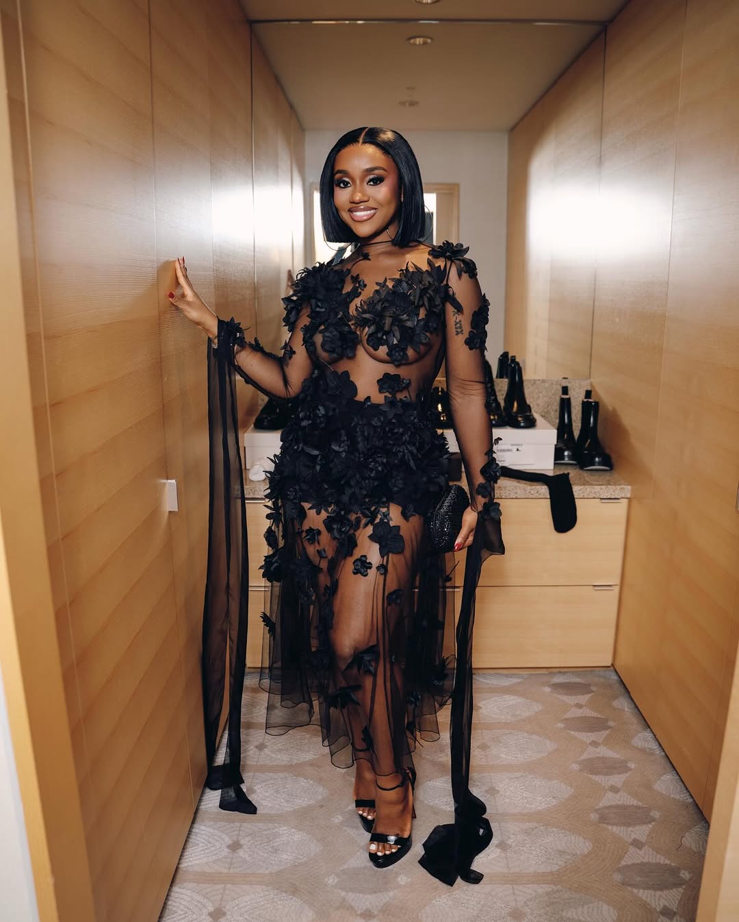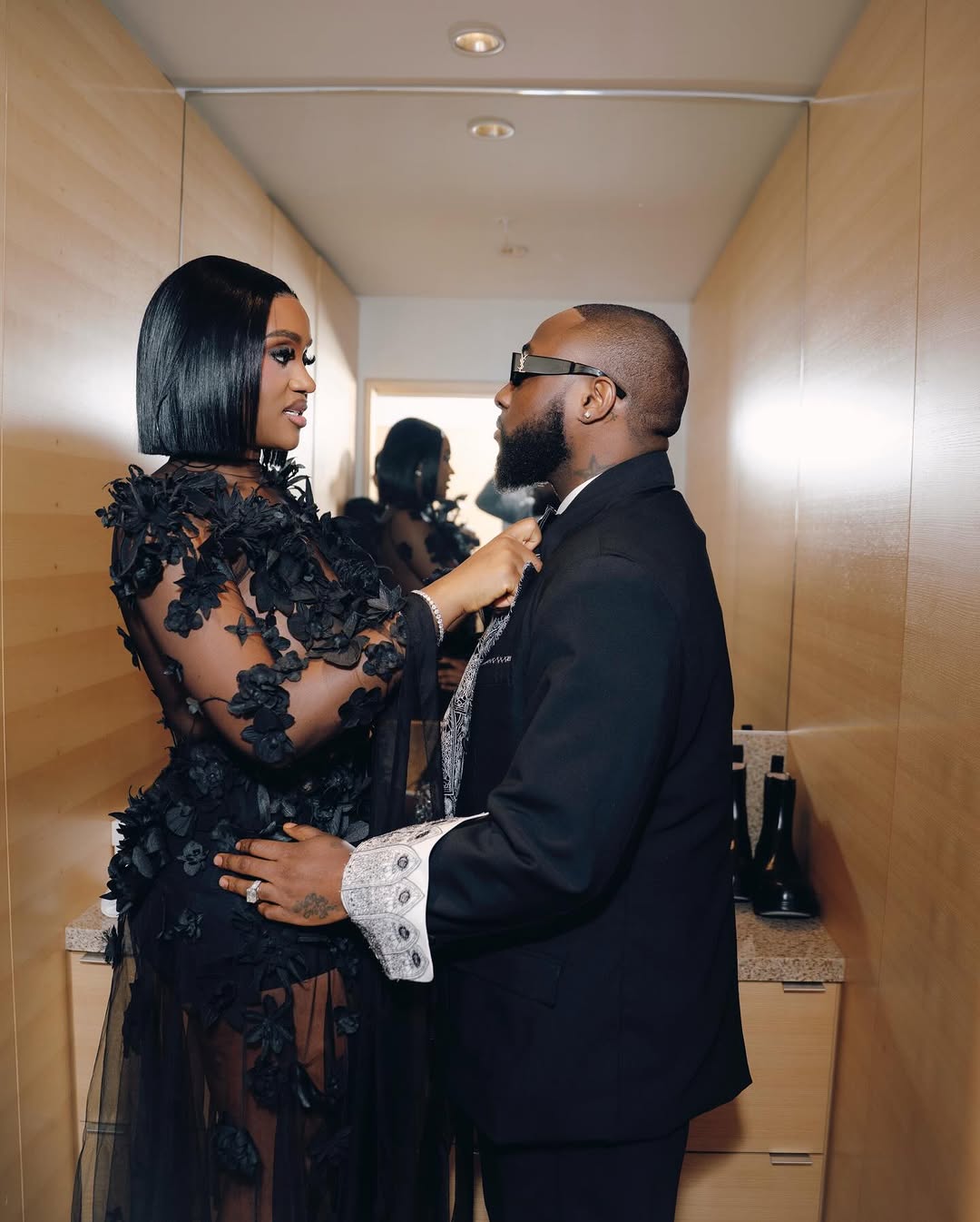 Styled by Vanessa Efe and Holly An Dro, who also dressed Davido for the evening, Adeleke’s accessories were intentionally restrained. Black Christian Louboutin stiletto sandals grounded the look, while jewellery by Justine Clenquet introduced a modern edge without competing with the dress’s intricate surface work. A sharply cut chin-length bob, worn with a centre part, and polished, minimal makeup completed the ensemble, allowing the gown’s craftsmanship to remain the focal point.