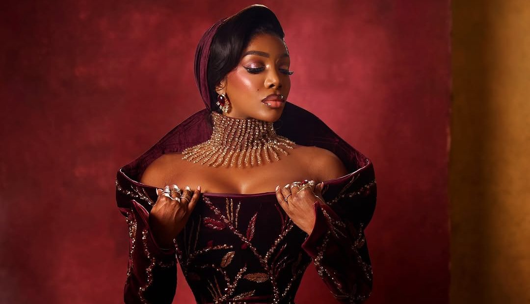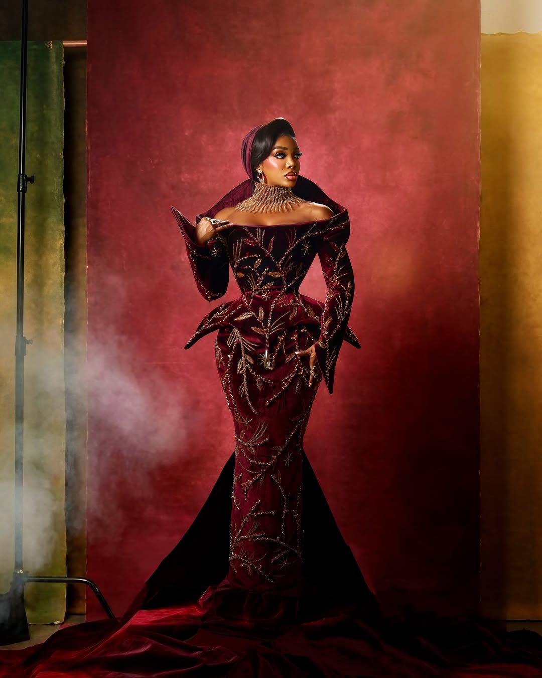 Her first appearance set the tone. Wearing a custom wine velvet ensemble by Sevon Dejana, Chioma stepped out in a structured corset and skirt with a sweeping train. The deep burgundy fabric was adorned with gold and wine crystal embellishments, forming delicate leaf and branch patterns that gave the look a painterly finish. Sculptural, wing-like shoulders framed the off-shoulder neckline, while a statement crystal choker and fluted sleeves added a regal, almost armour-like presence.