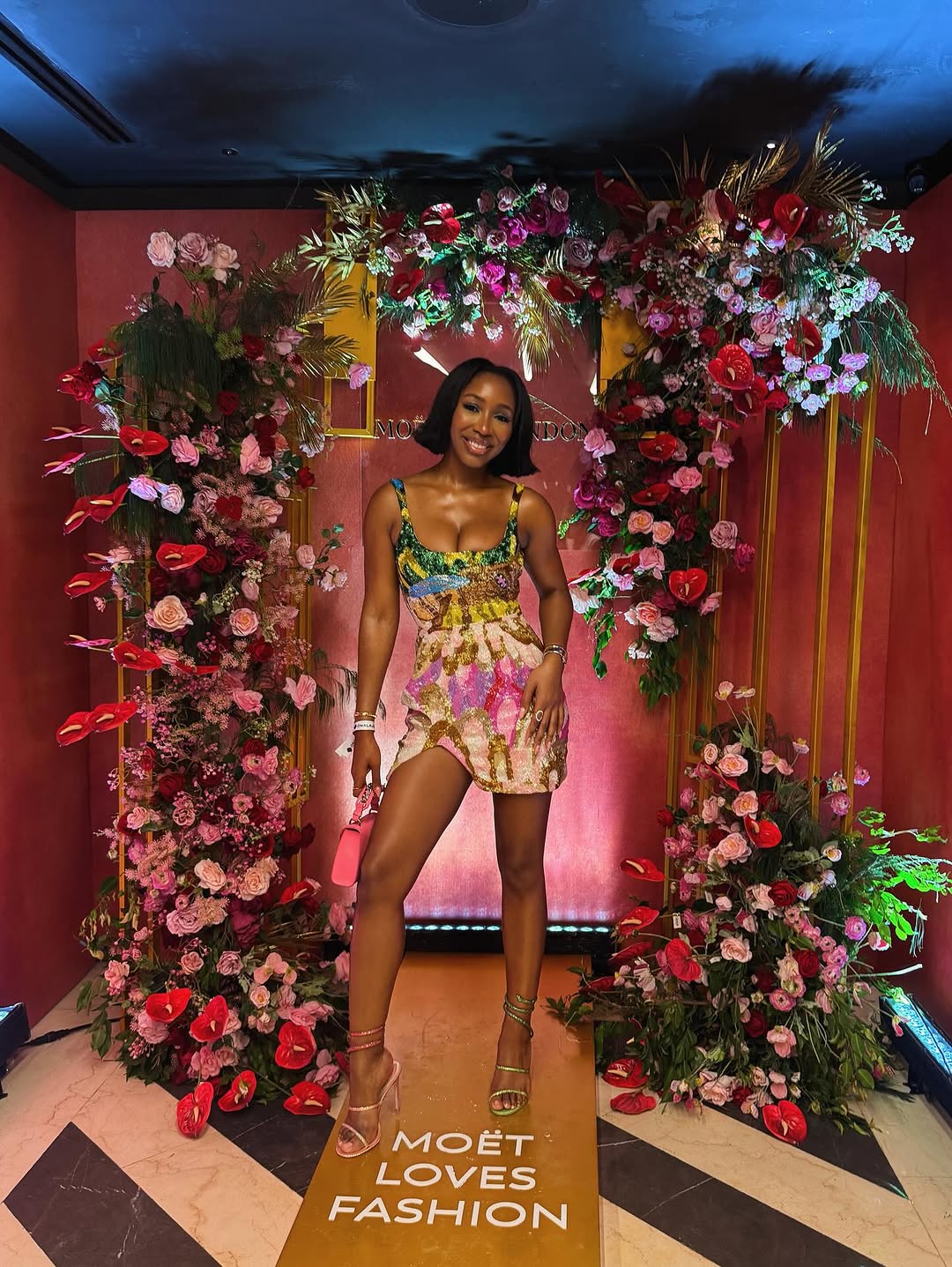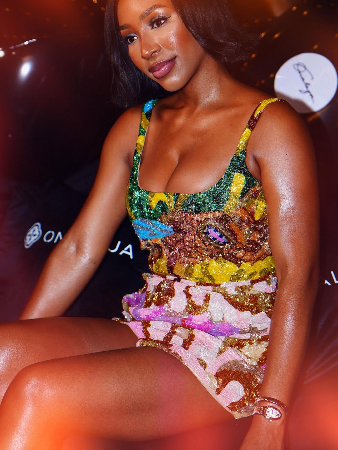 Beside her, Chi-Chi shimmered in a sequinned mini dress that could easily double as a disco ball for the gods — emerald green melting into coral, pink, gold, and ocean blue in an abstract watercolour pattern. “Lagos, I’m home,” she said, and we believed her. The dress, the energy, the unapologetic sparkle — it all screamed main character.