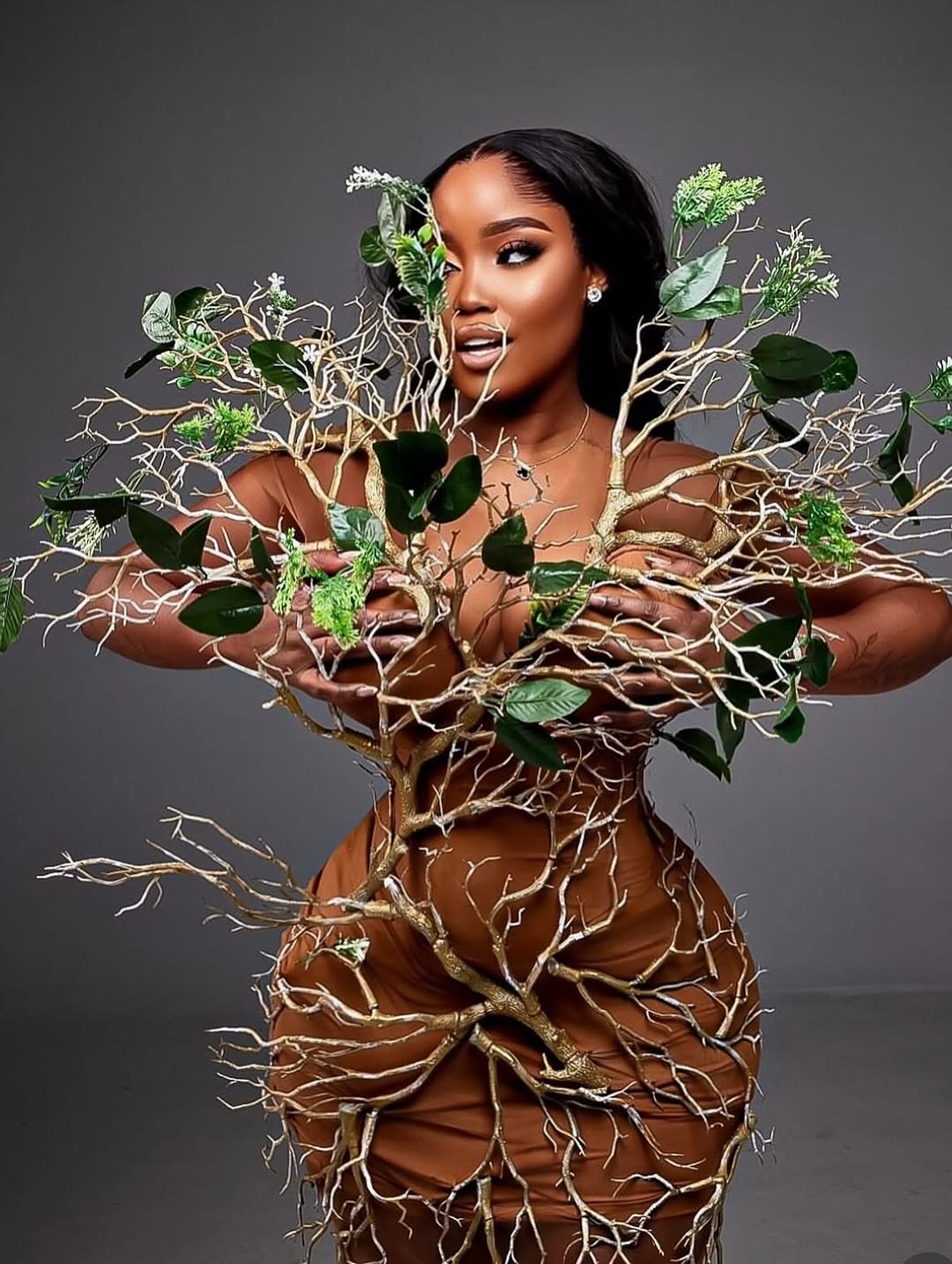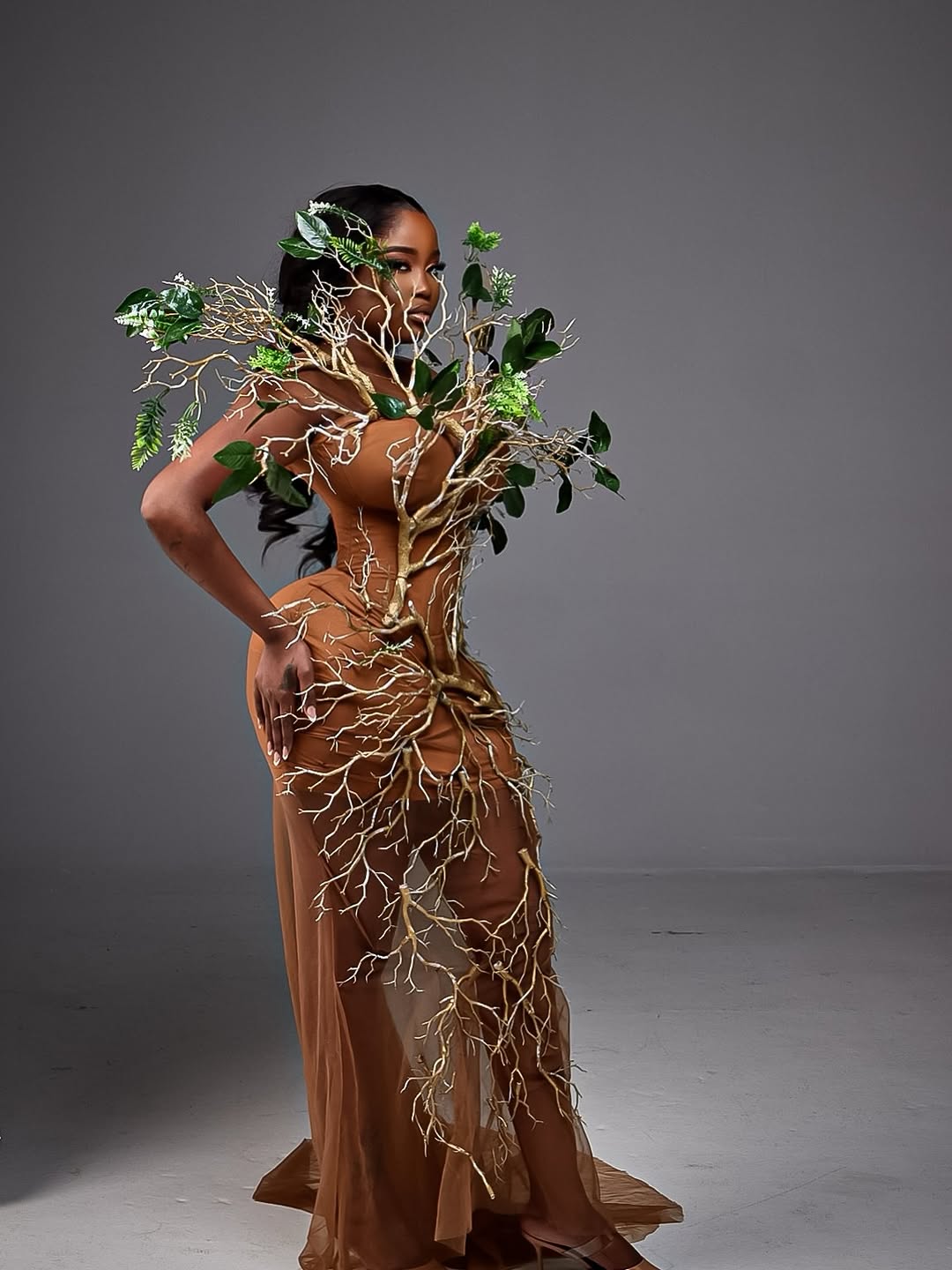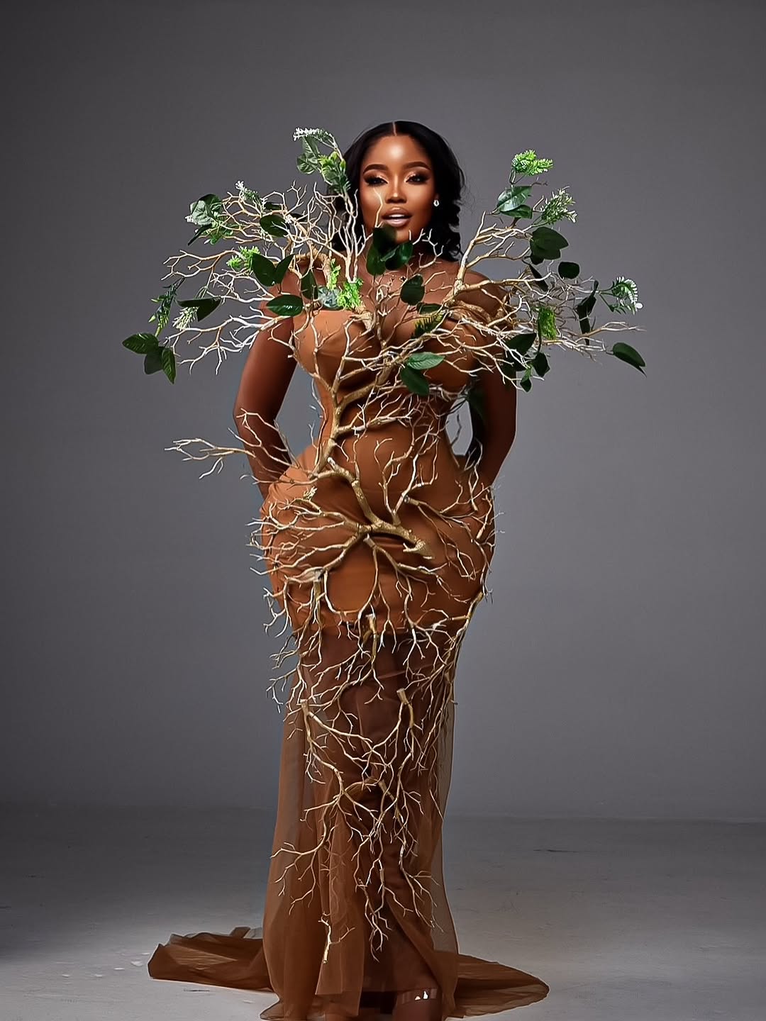 The dress was designed by Nigerian fashion label Erica Moore, and let’s just say—she understood the assignment and then gave it a PhD. The silhouette mimicked the strength and spread of a baobab’s trunk and limbs, while textured fabric, earthy greens, and rich browns echoed bark, roots, and resilience. It was high drama meets deep heritage.