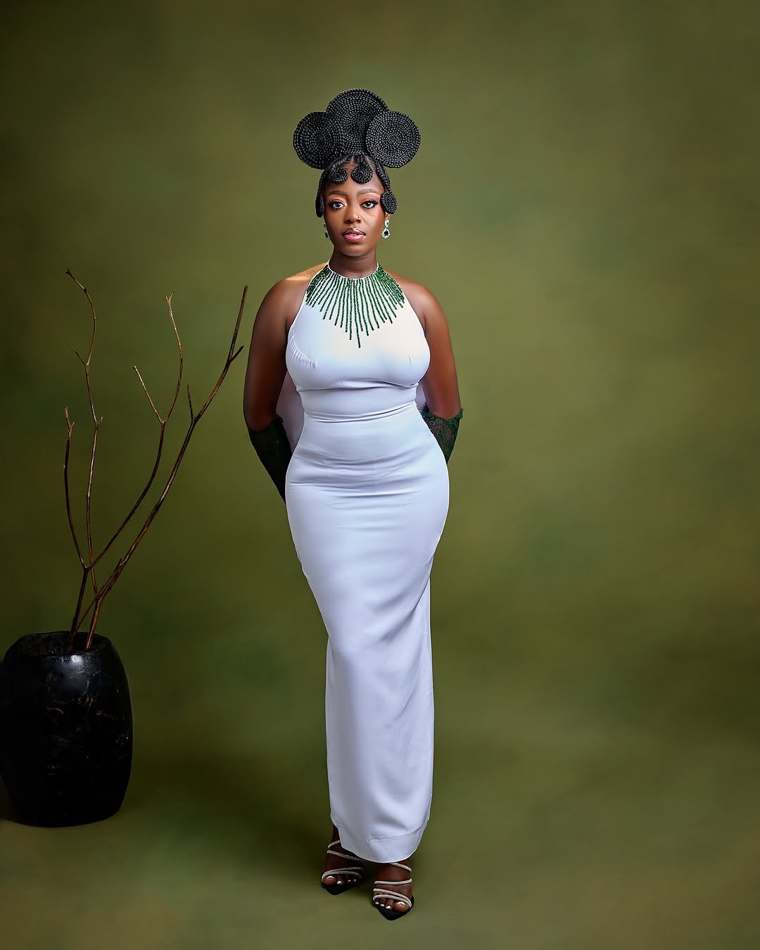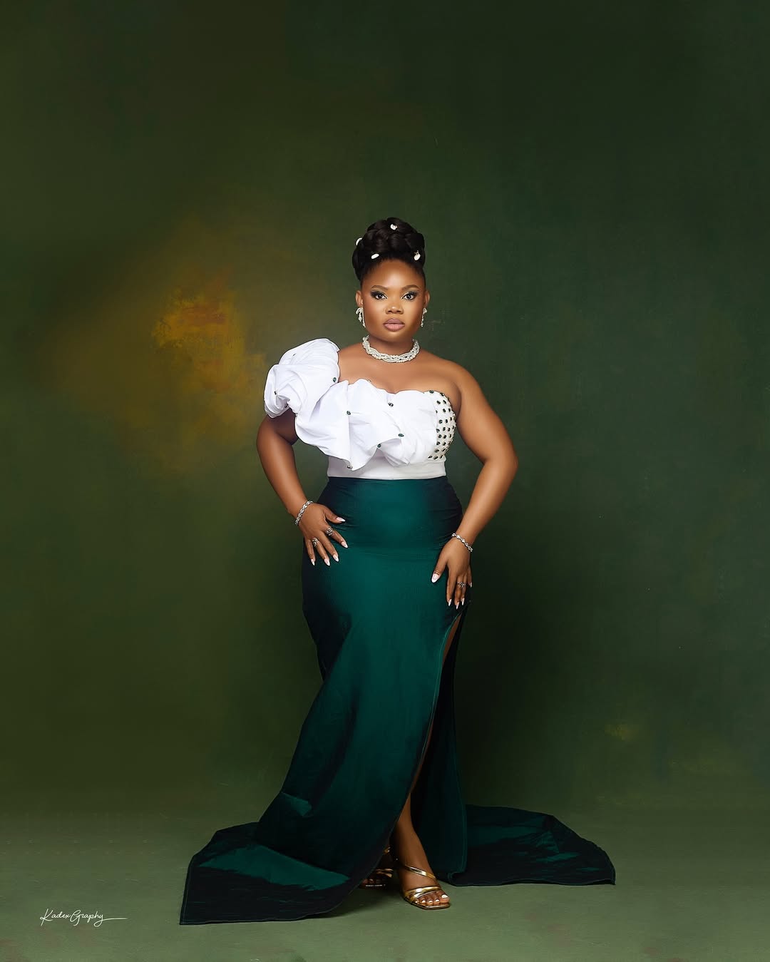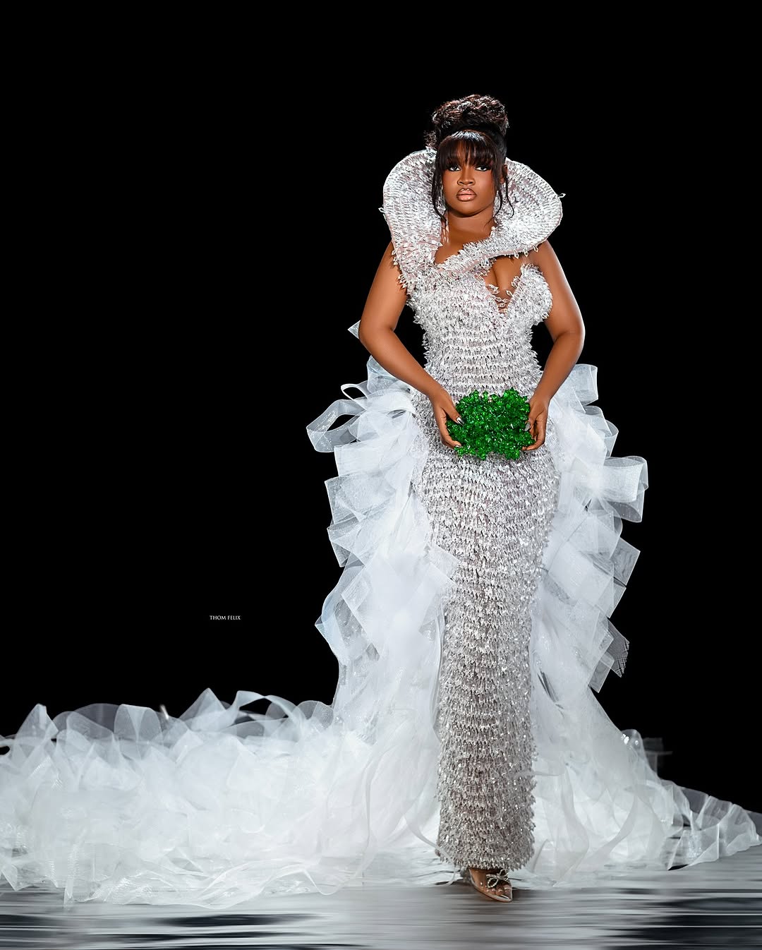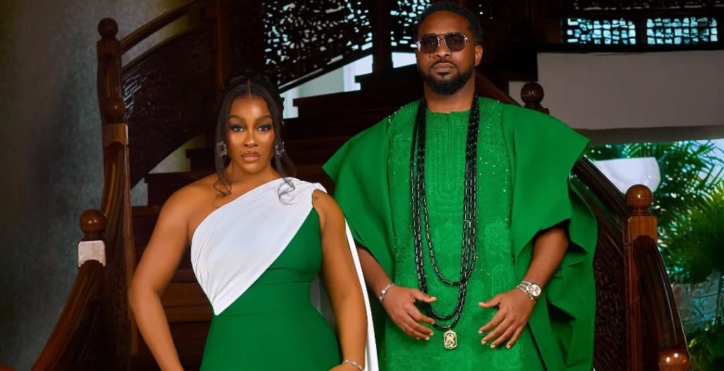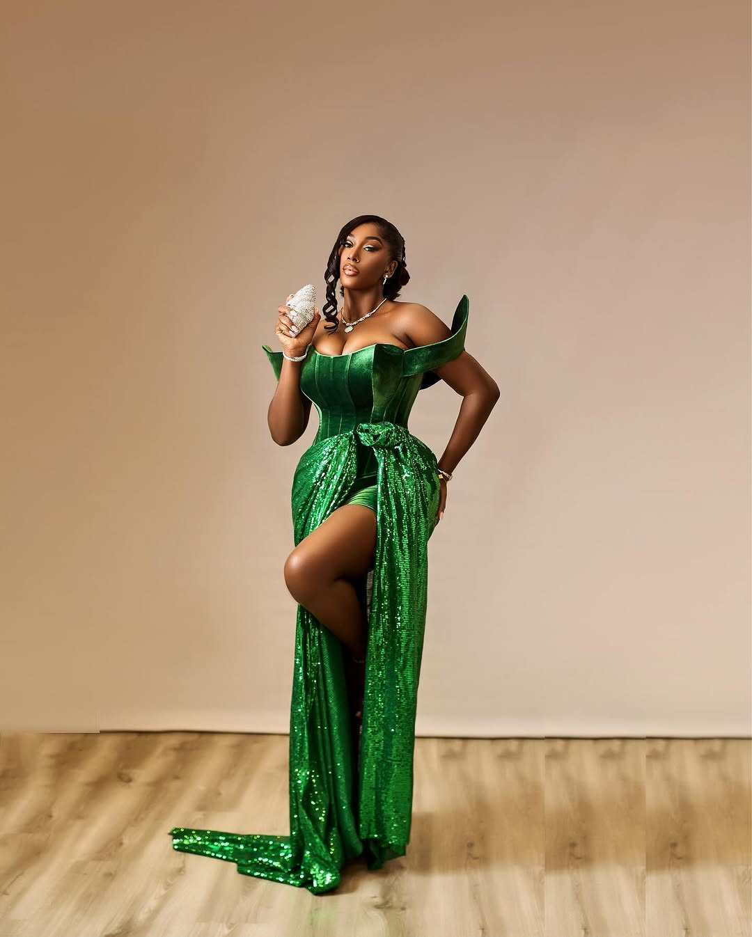 Uriel Oputa floated in like she’d been air-dropped from a runway. Her green-and-white one-shoulder gown was giving “Greek goddess meets Nollywood premiere” — complete with a sweeping drape cascading dramatically from shoulder to floor. The glam? Precision brows, liner sharp enough to cut glass, and a soft lip that whispered “I woke up like this (but with a glam squad).”