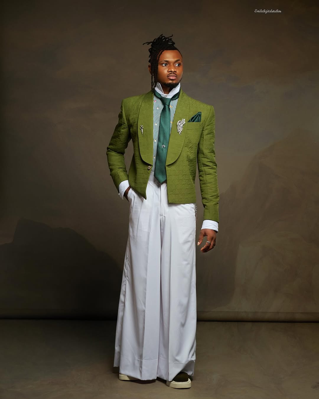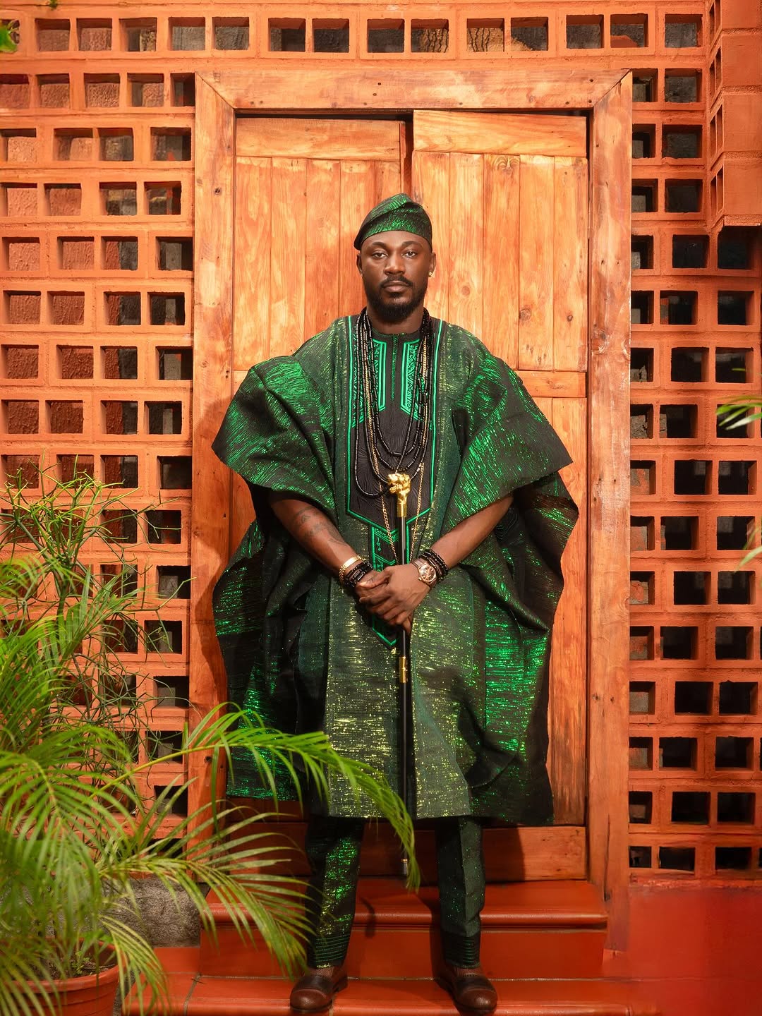 Co-host Uzor Arukwe proved agbada is a lifestyle, not just an outfit. His plain green fit wasn’t plain at all — intricate embroidery across chest and hem gave “royalty at ease.” The accessories? Layered black beads with a golden pendant (because why stop at one when you can drip in three?), plus a stainless wristwatch for that subtle “I’m busy but I look good” energy.