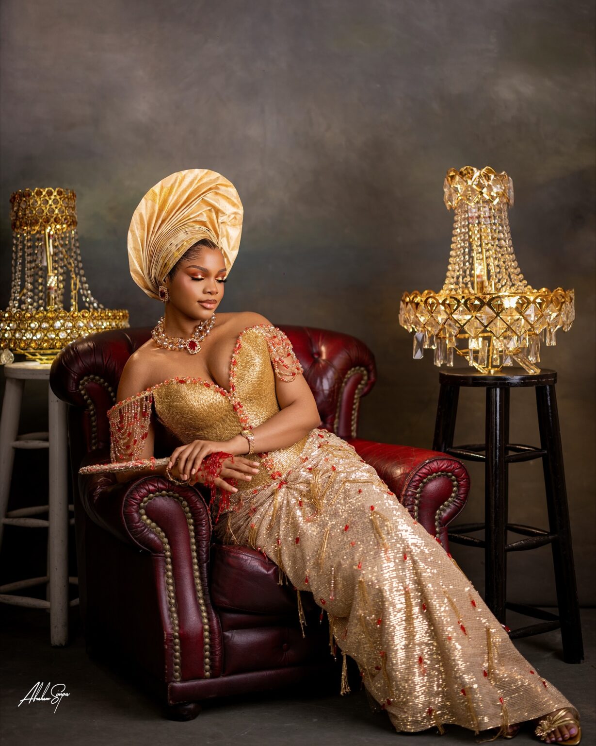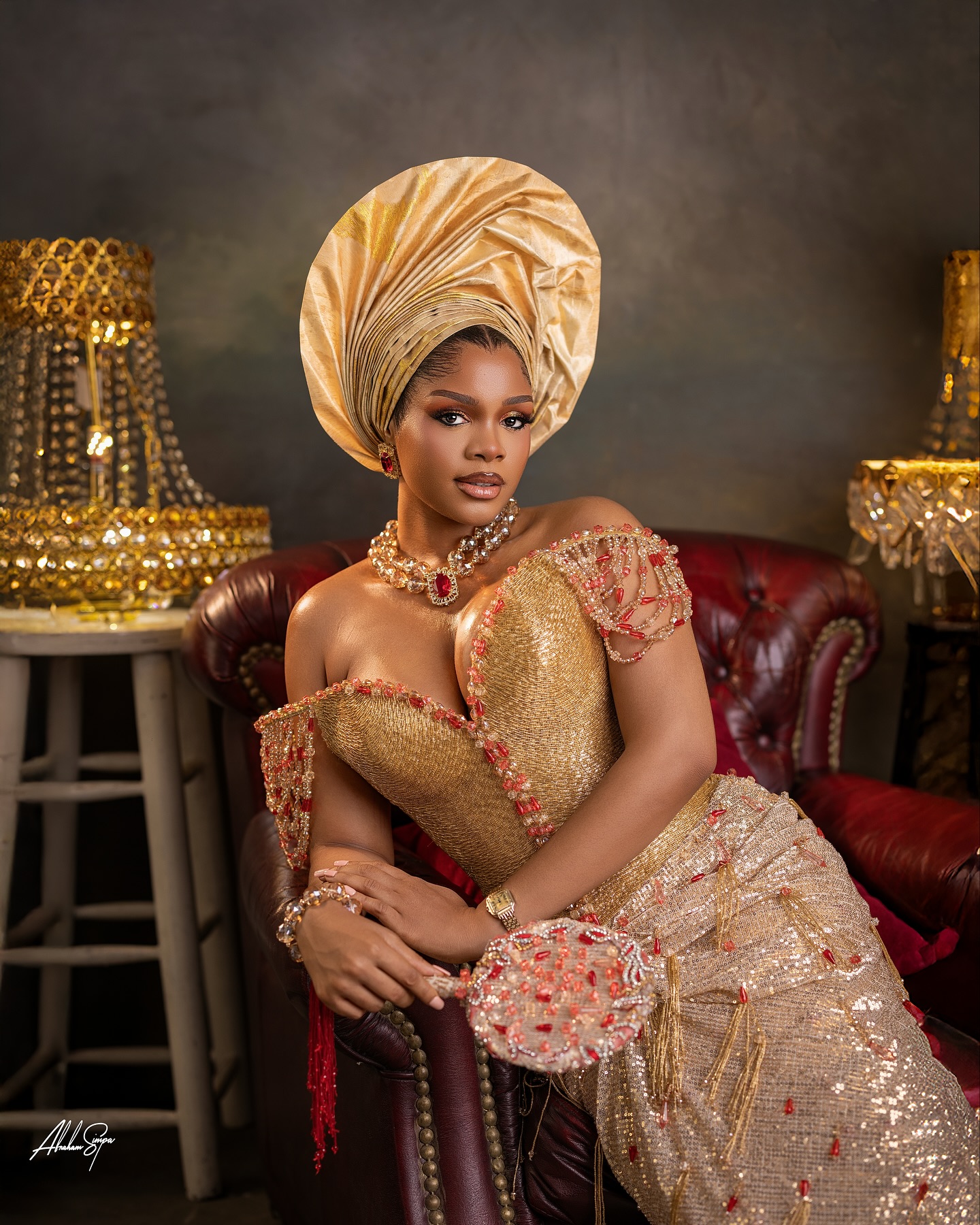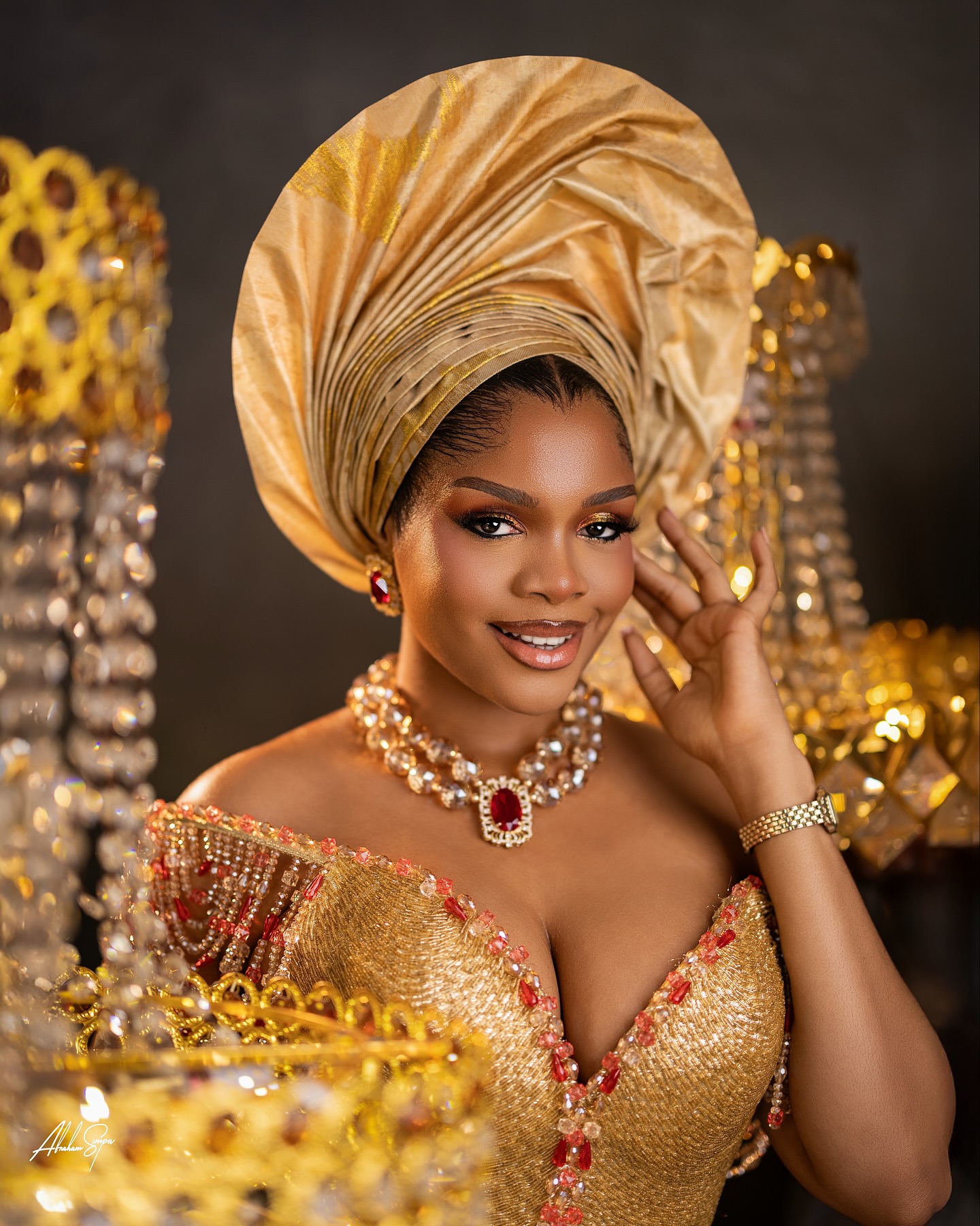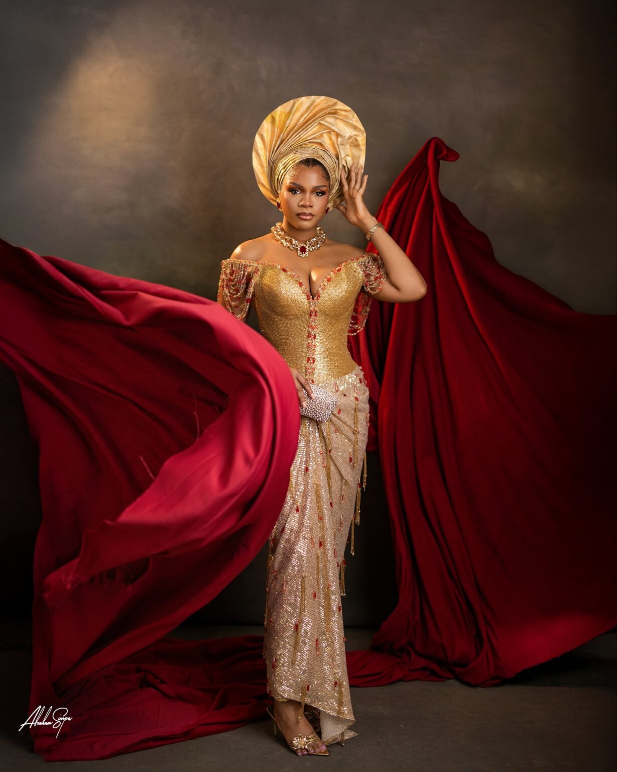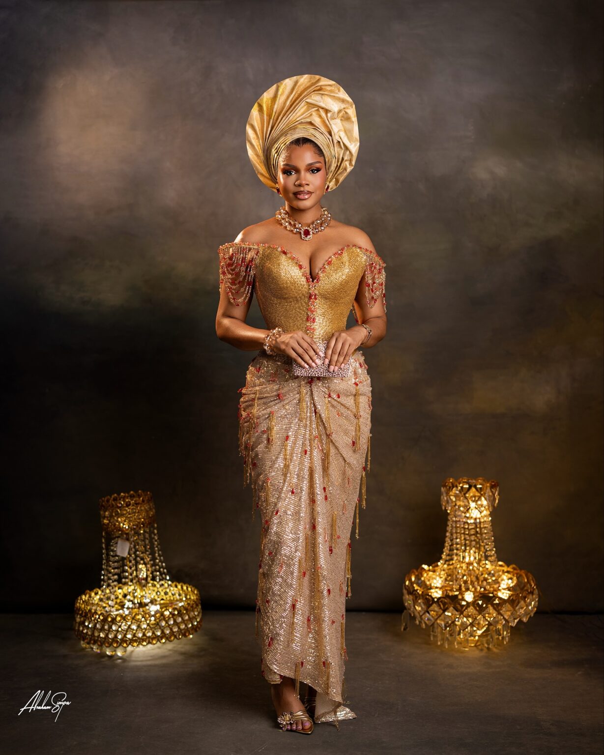 Credit: Makeup @dyanbeauty__ | Outfit @bibiclassy | Gele @ene_rozzy | Content creator @abujaflix | Hair @hairflutter | Muse @reign.ade | Jewelry @okukuandgelebyoreke | Fabric @fabrics_by_maciscas | Photography @abrahamsimpaphotography |
