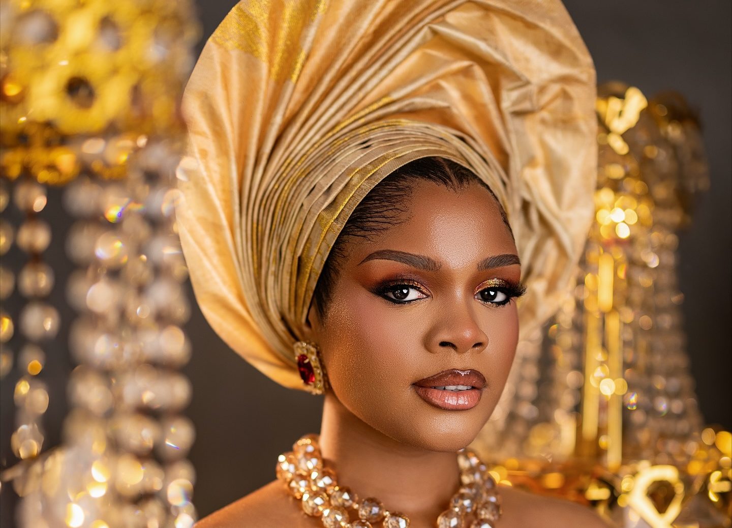 The gele, a sculptural masterpiece by Ene Rozzy, sits like a crown that knows its worth — structured, sleek, and unapologetically regal. And then there’s the finishing touch: Dyan Beauty’s makeup look that plays perfectly into the light, giving the bride that ethereal “I’m glowing, not sweating” finish every camera loves.