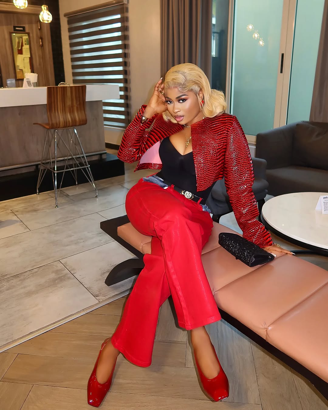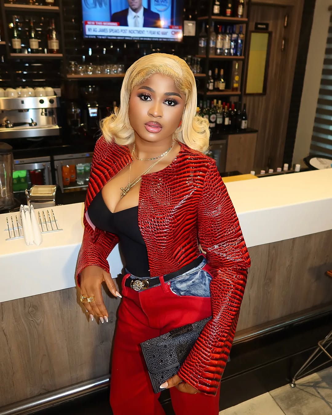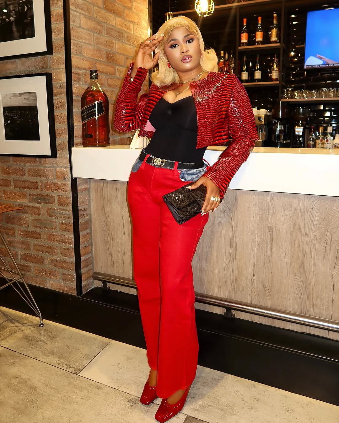 Let’s talk fashion. Imisi’s look was a study in bold color-blocking — bright red wide-leg trousers, a black sweetheart corset top, and a cropped red metallic bolero jacket that screamed main character energy. She sealed the deal with red pointed heels, a black belt with silver buckle, layered gold necklaces, and a black clutch. Her blonde waves and nude lips added just enough softness to balance the power of that red.