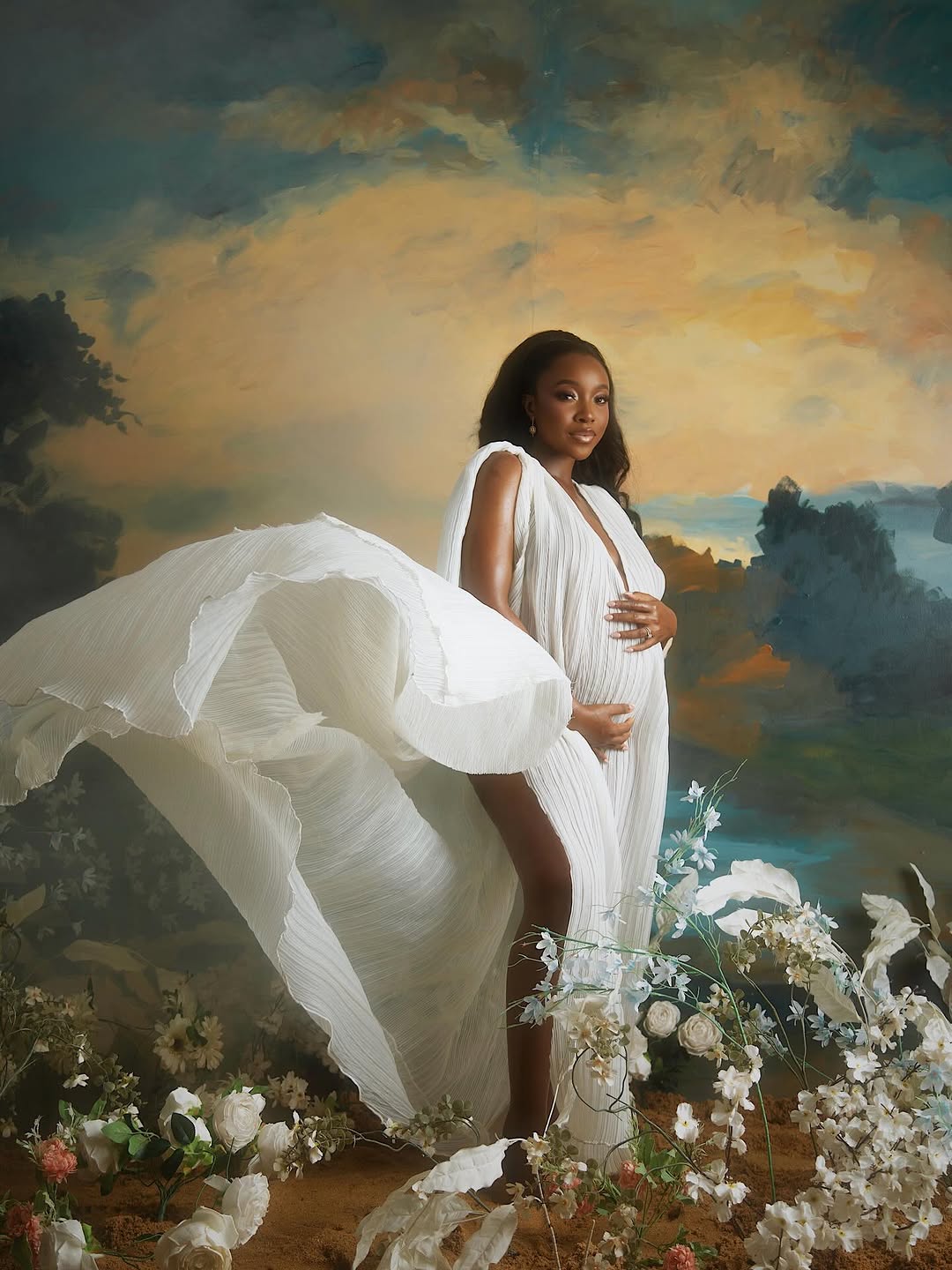 Her beauty look is intentionally restrained. Straight, shoulder-length hair frames her face, while dewy skin and soft makeup allow her natural glow to take focus. With both hands resting gently on her bump, she meets the camera with a calm, open gaze one that carries both presence and peace.