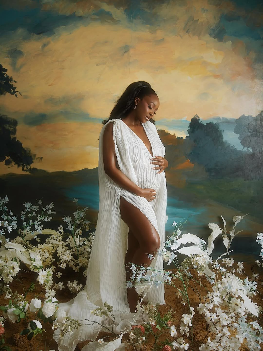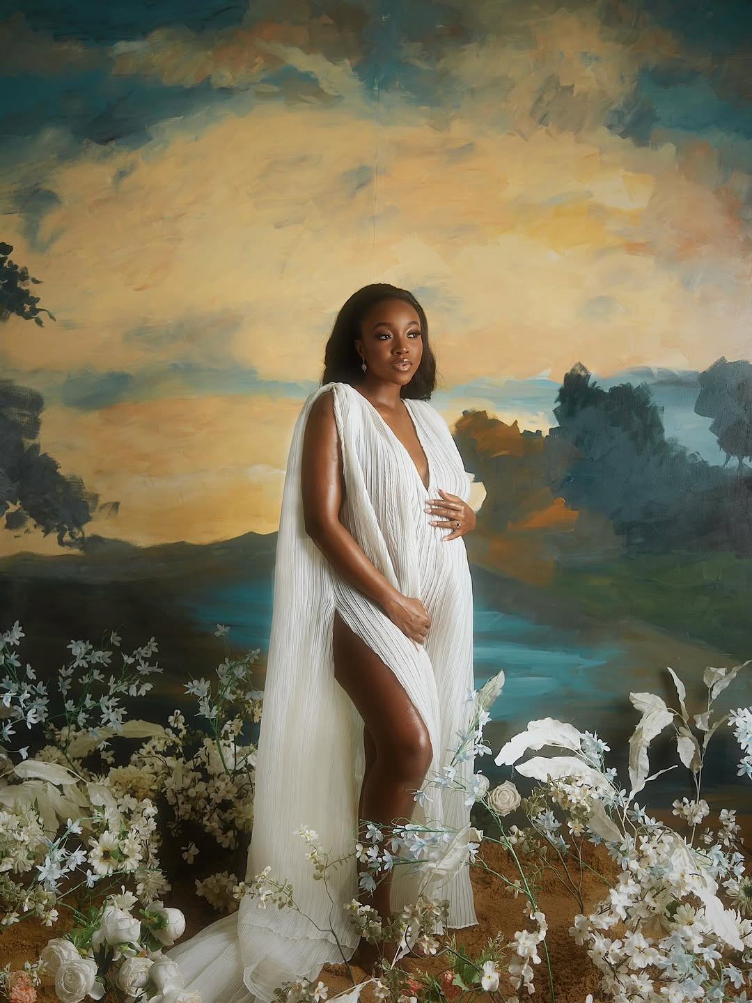 Following the release of her deeply moving short film, the actress unveiled a series of portraits that feel less like a photoshoot and more like stepping into a living painting. Captured by Chuchu Ojekwe, the images unfold against an ethereal, impressionist-style landscape—golden skies, shadowed trees, and a quiet stretch of water in the distance. It’s a setting that evokes the softness and drama of Renaissance art, where every detail is deliberate and every frame feels suspended in time.