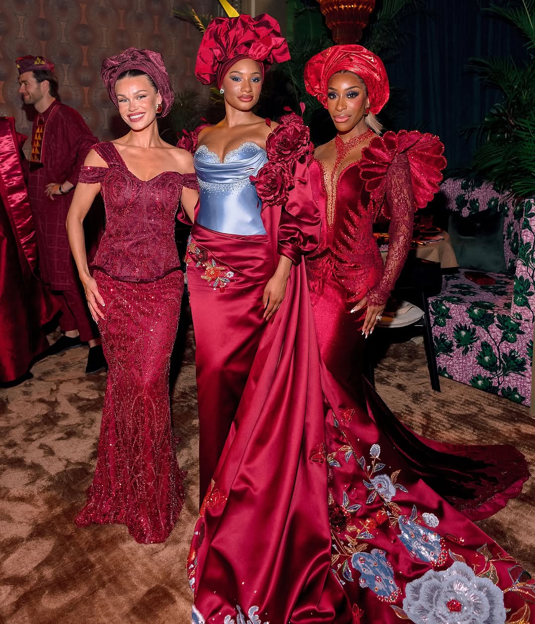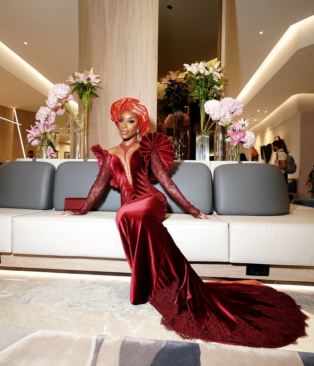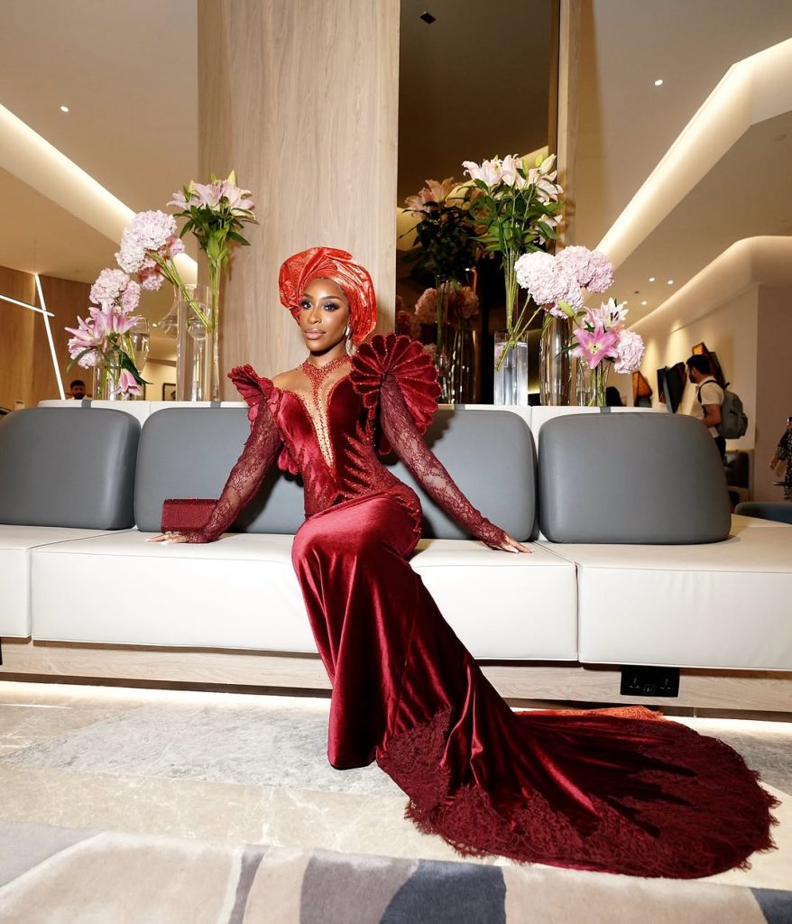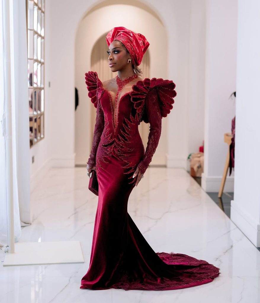 Jackie chose Nigerian designer Veekee James for the occasion, stepping out in a velvet mermaid gown that married tradition with high-fashion drama. Think: lace sleeves, intricate beadwork, petal-like shoulder accents that looked sculpted to perfection, and a train that trailed with unapologetic grandeur. Basically, this wasn’t just a dress—it was an entrance.