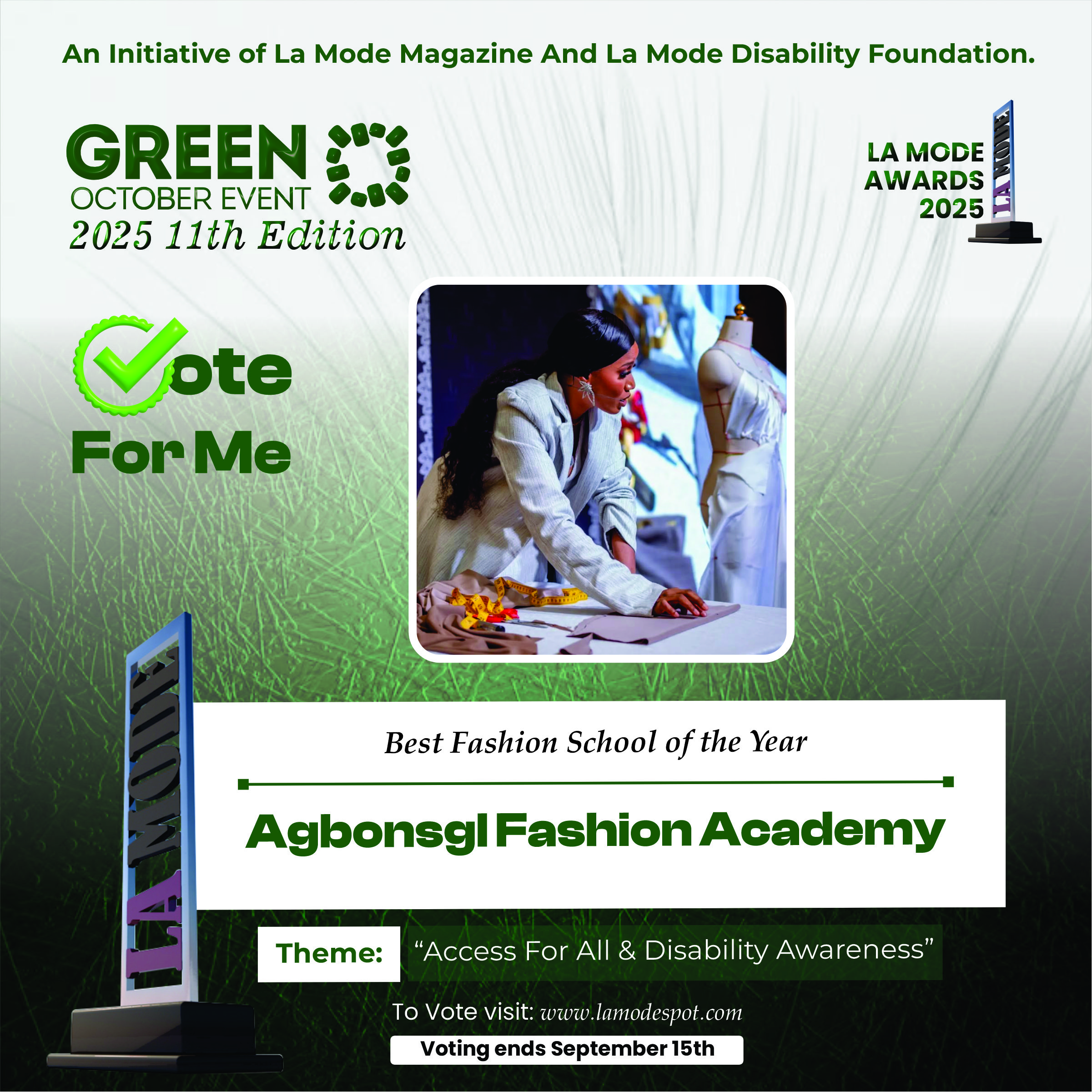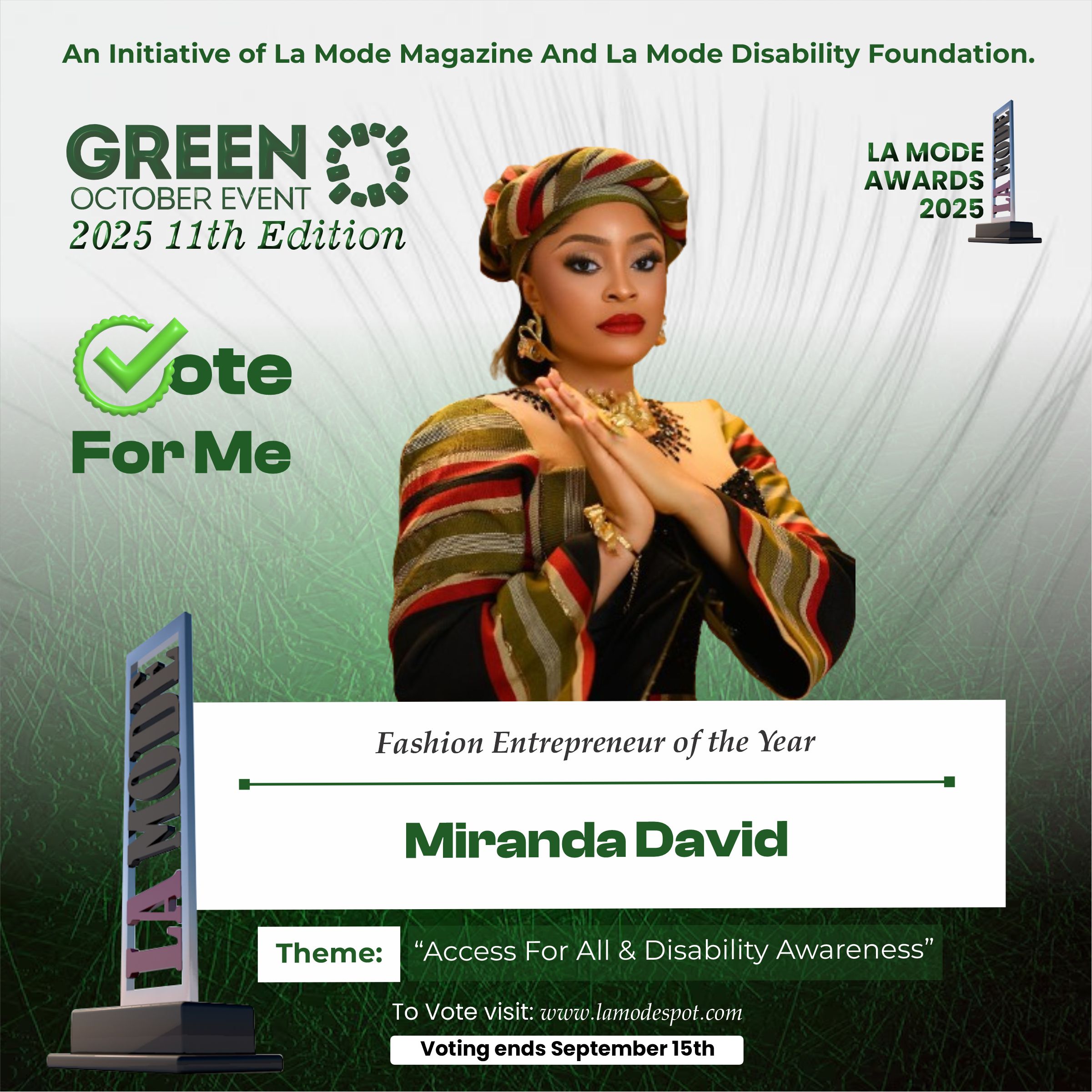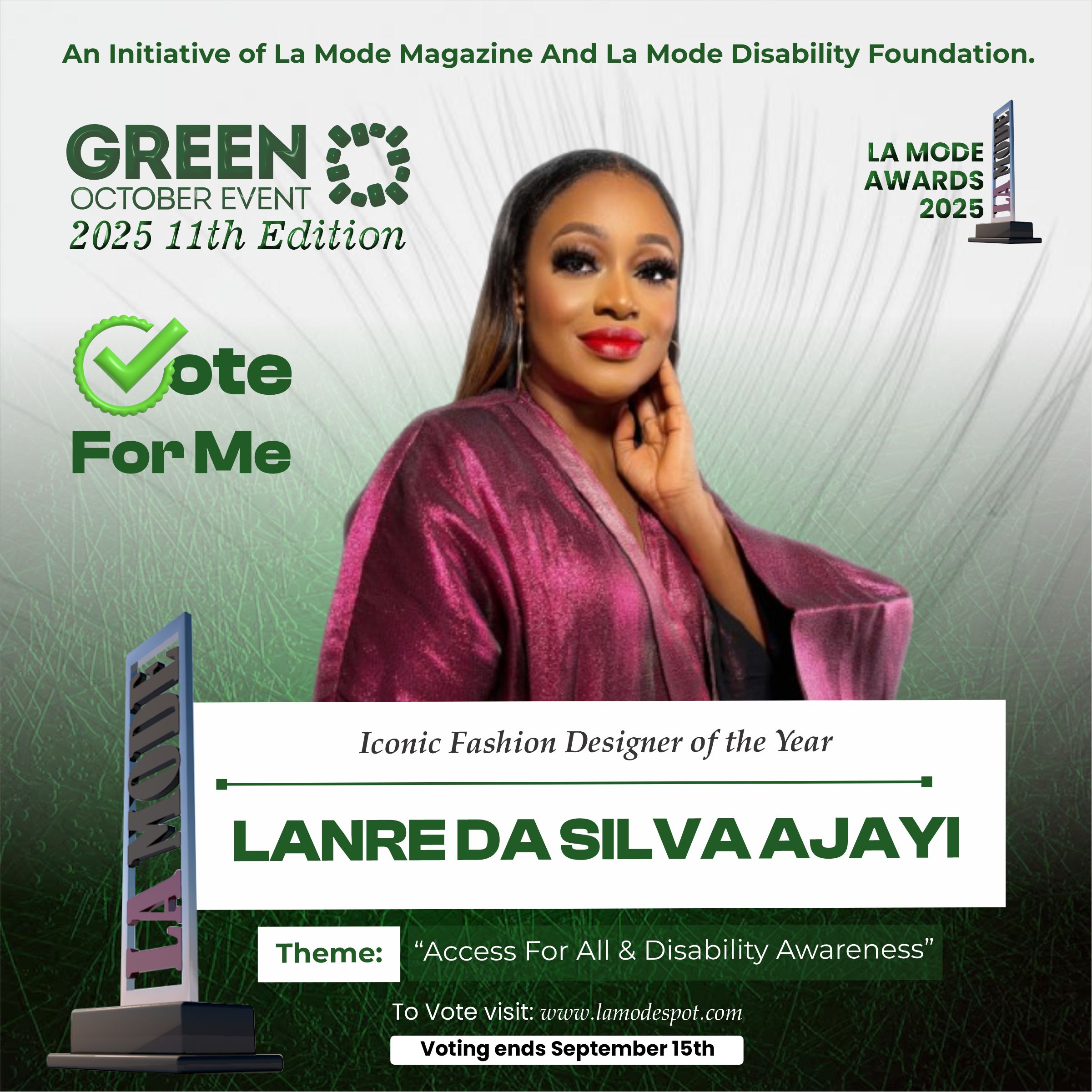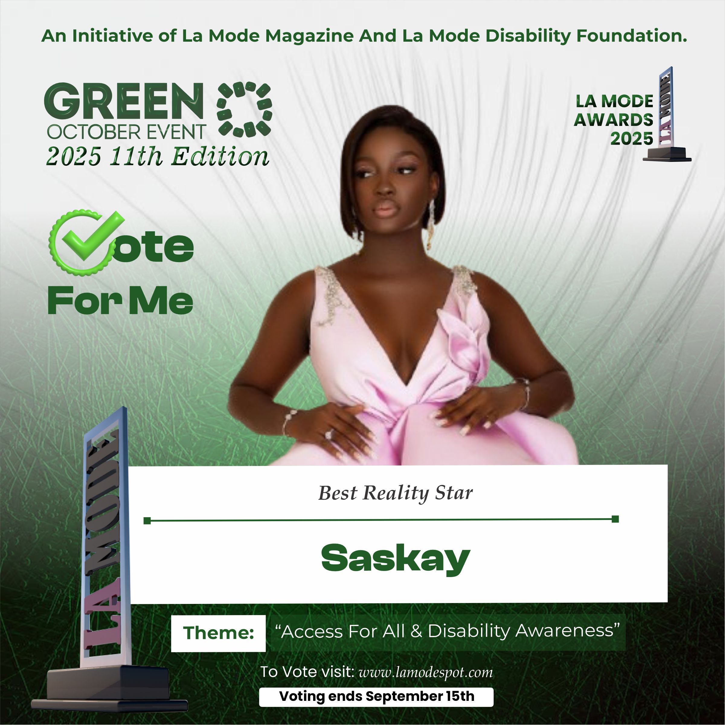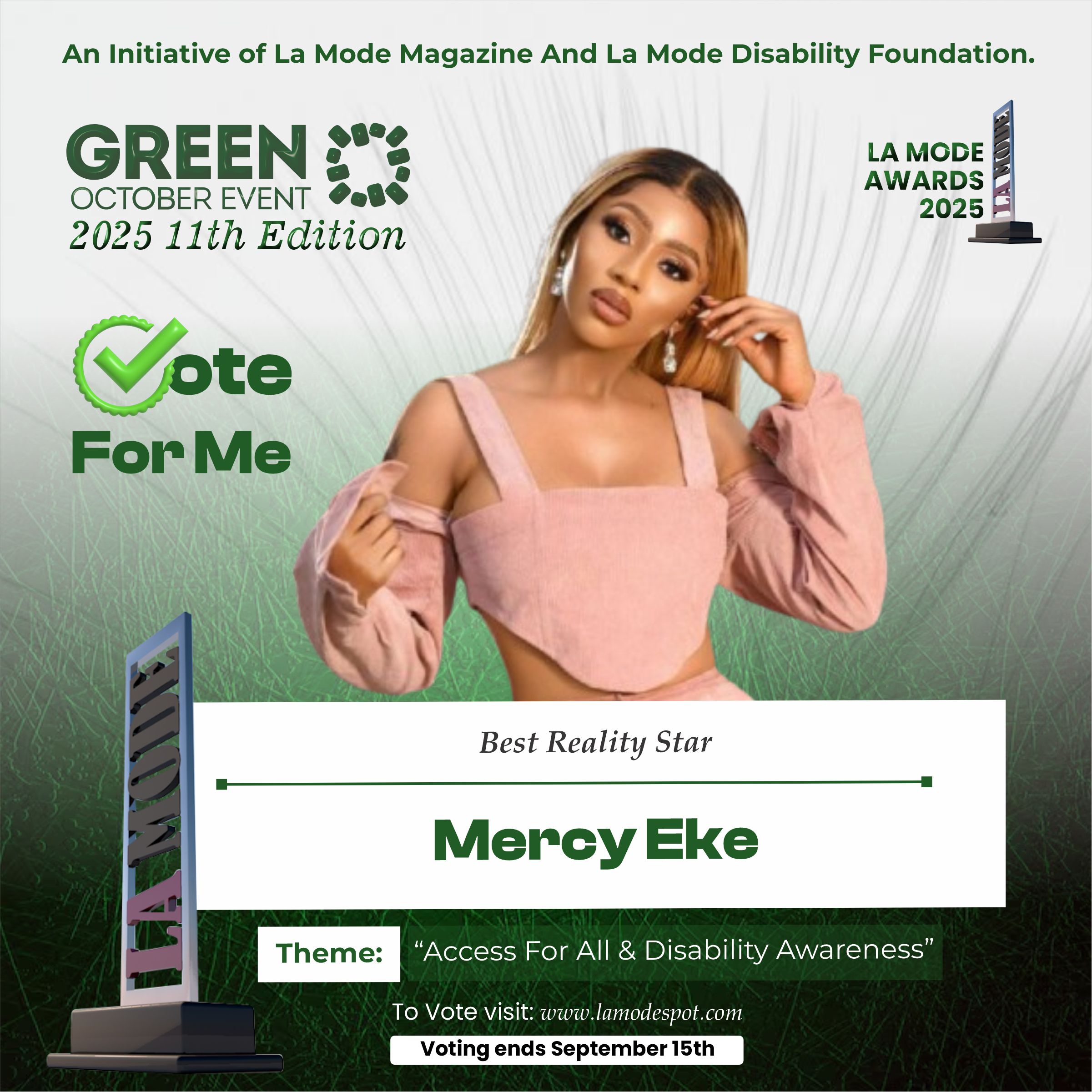 Please note funds generated from the voting process goes to La Mode Magazine Disability Foundation and for Disability Awareness Drive.