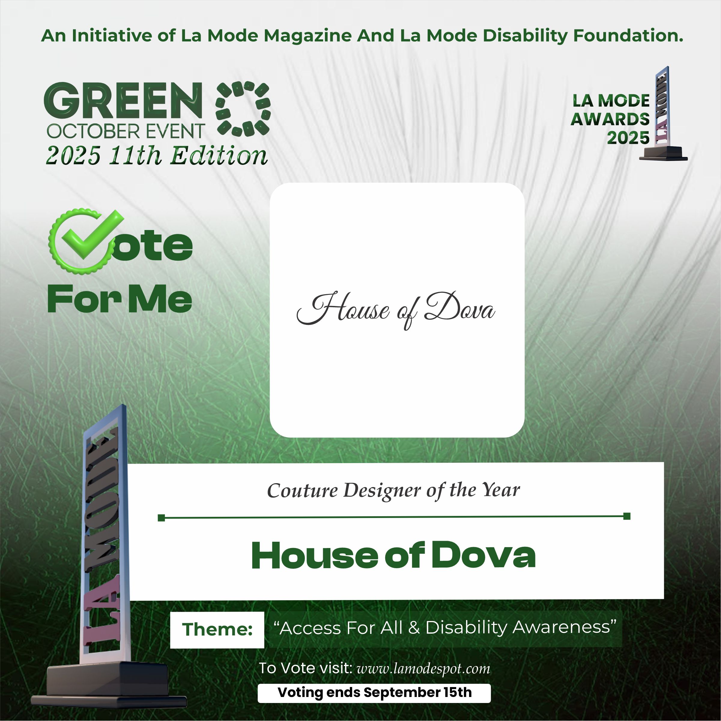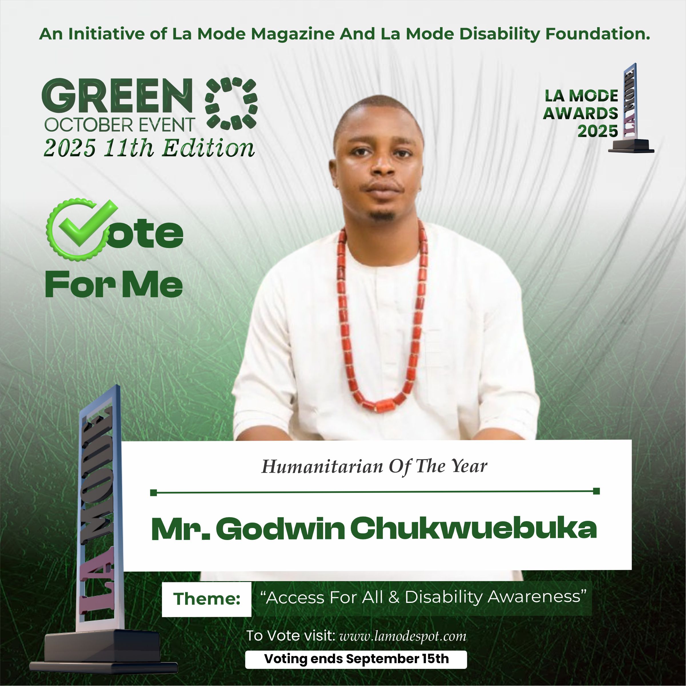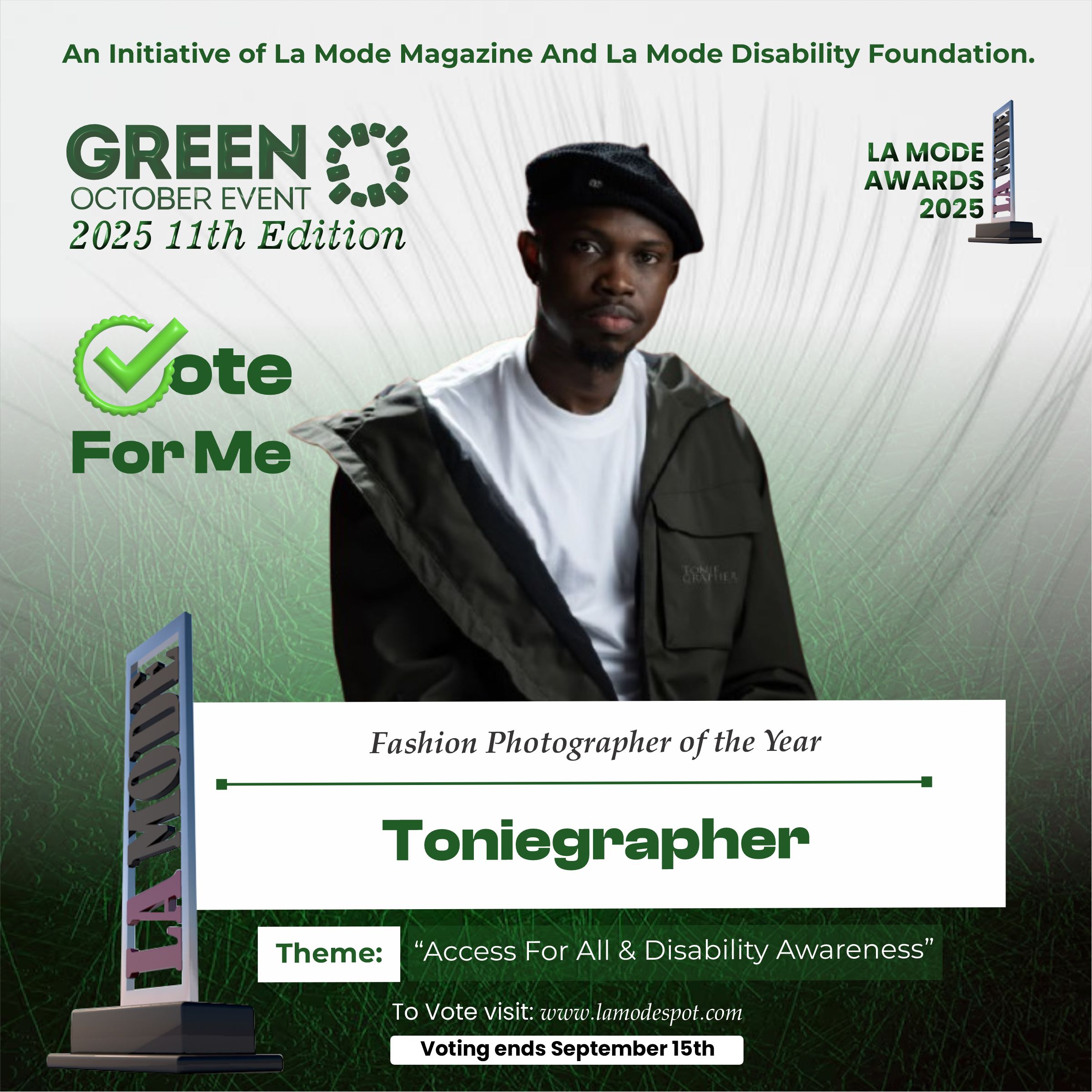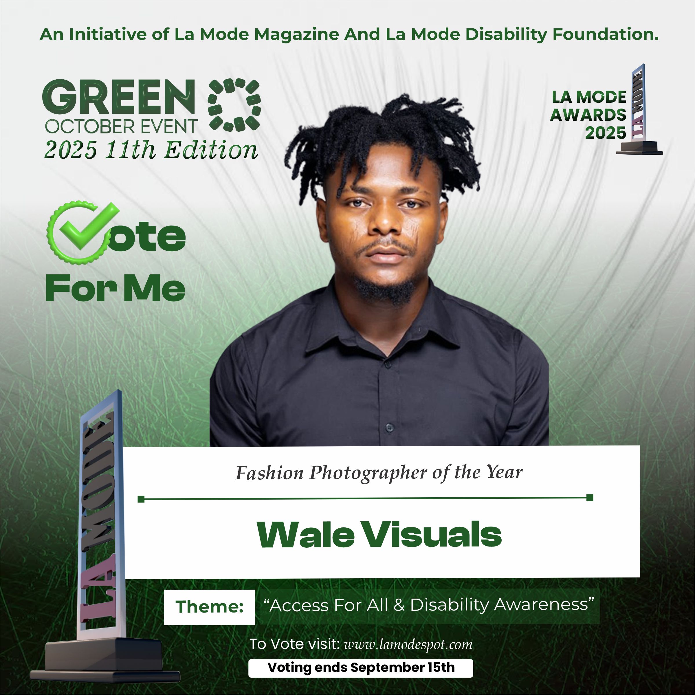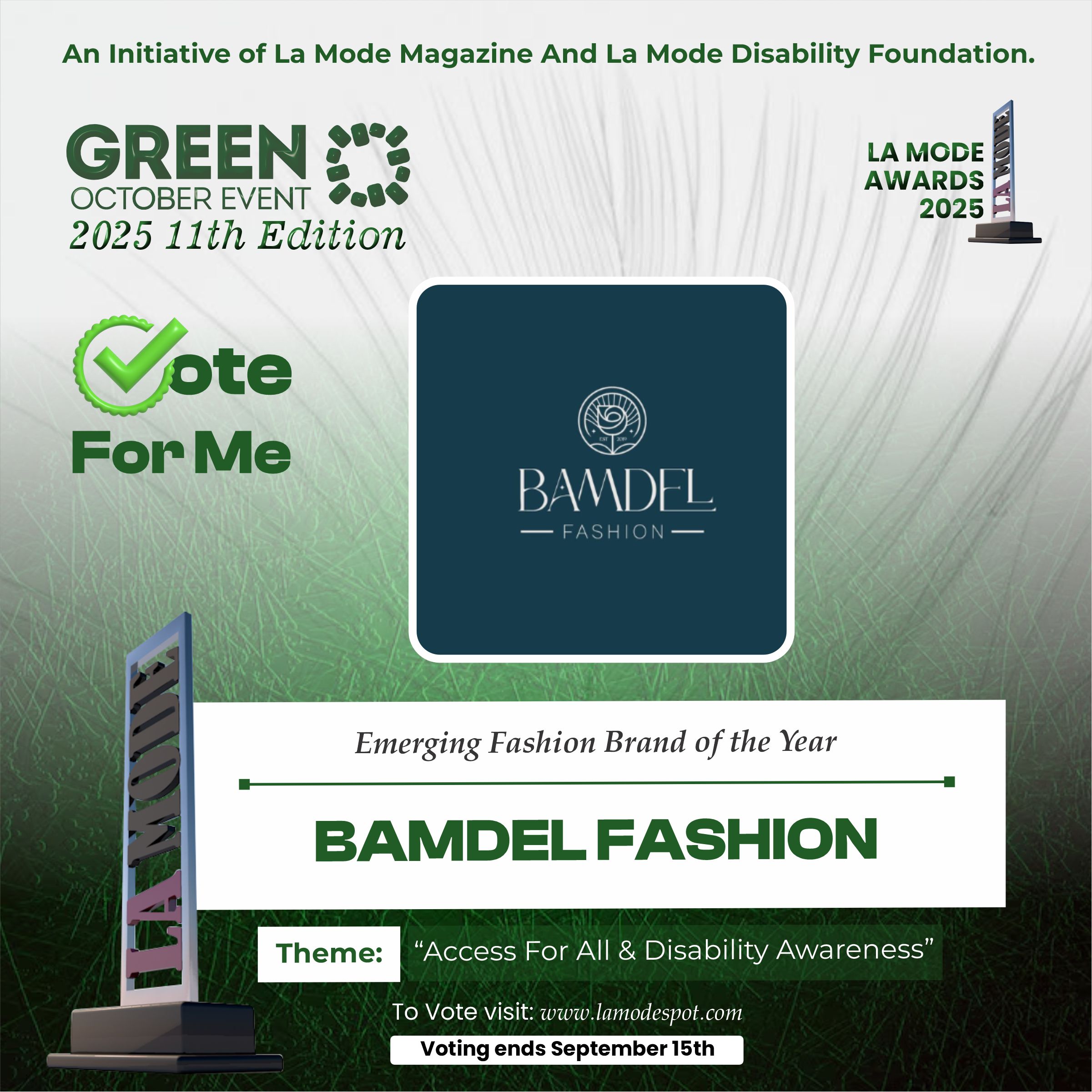Please note funds generated from the voting process goes to La Mode Magazine Disability Foundation and for Disability Awareness Drive.