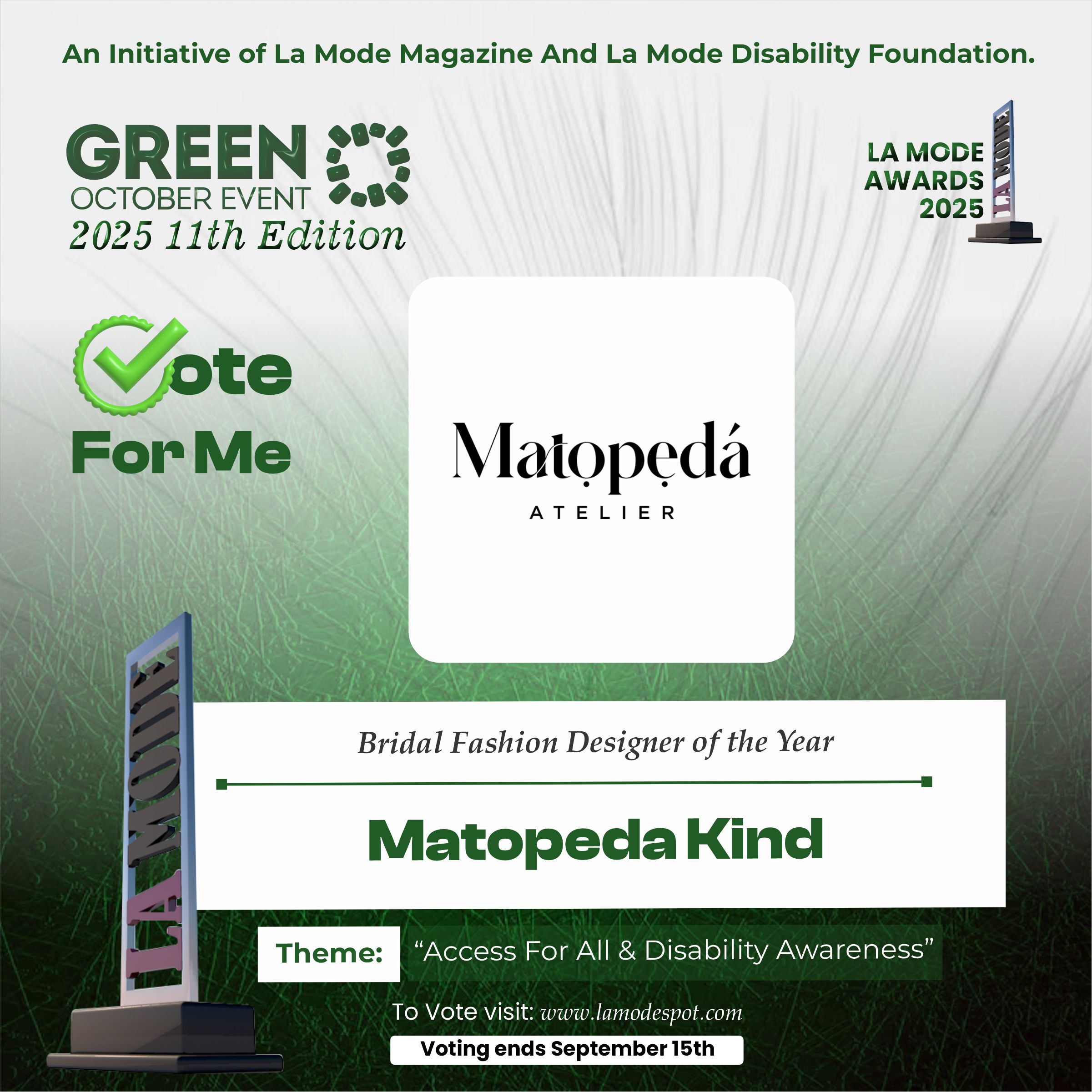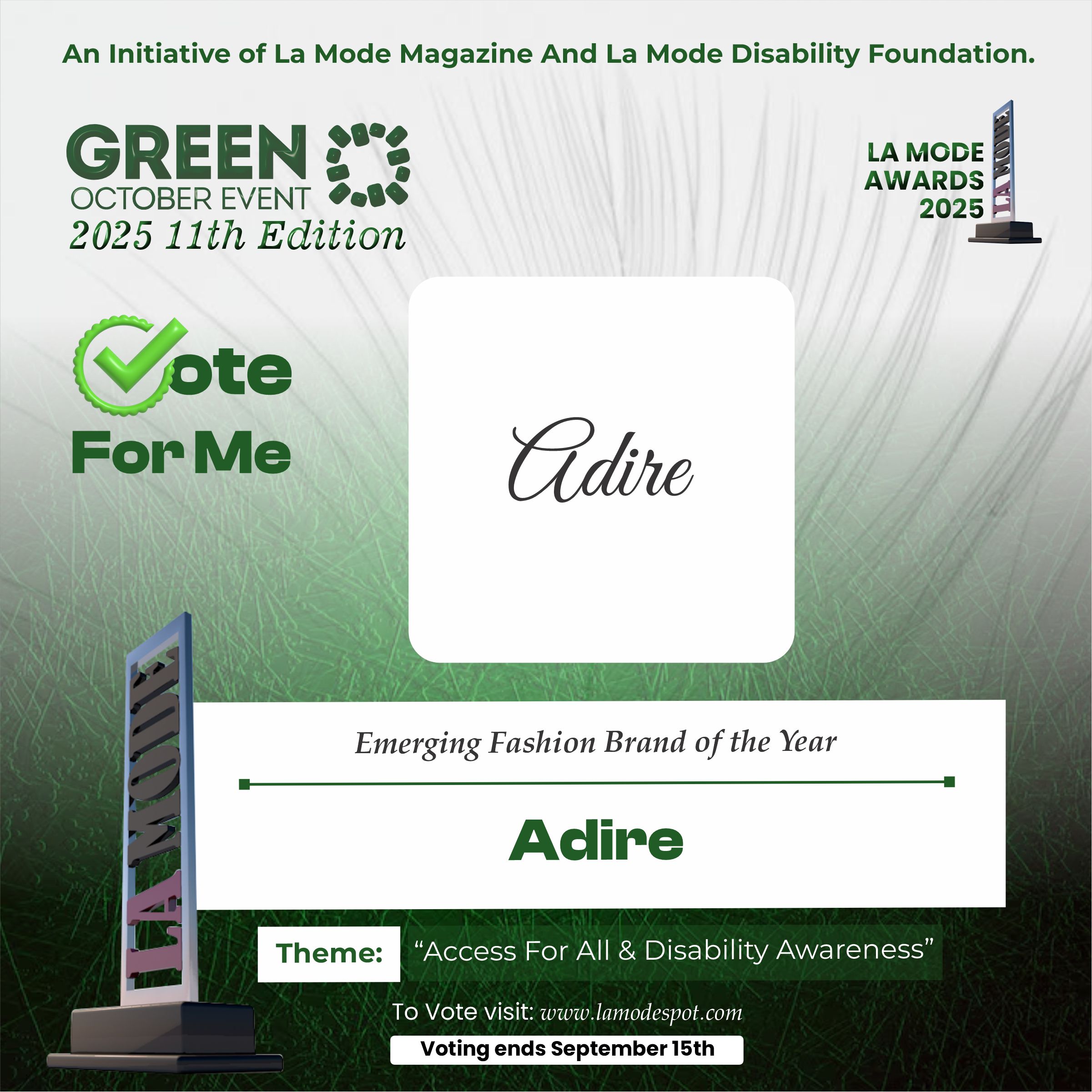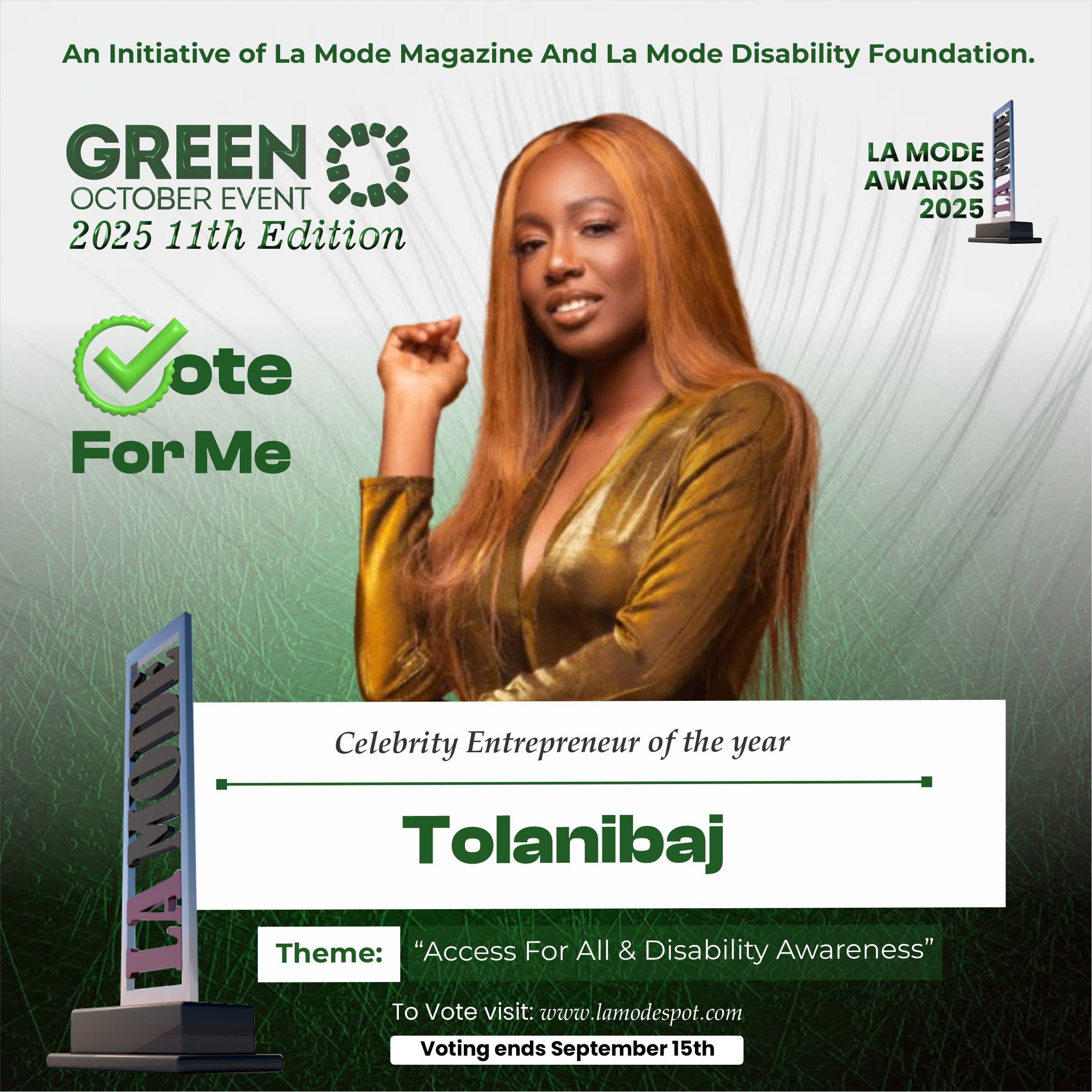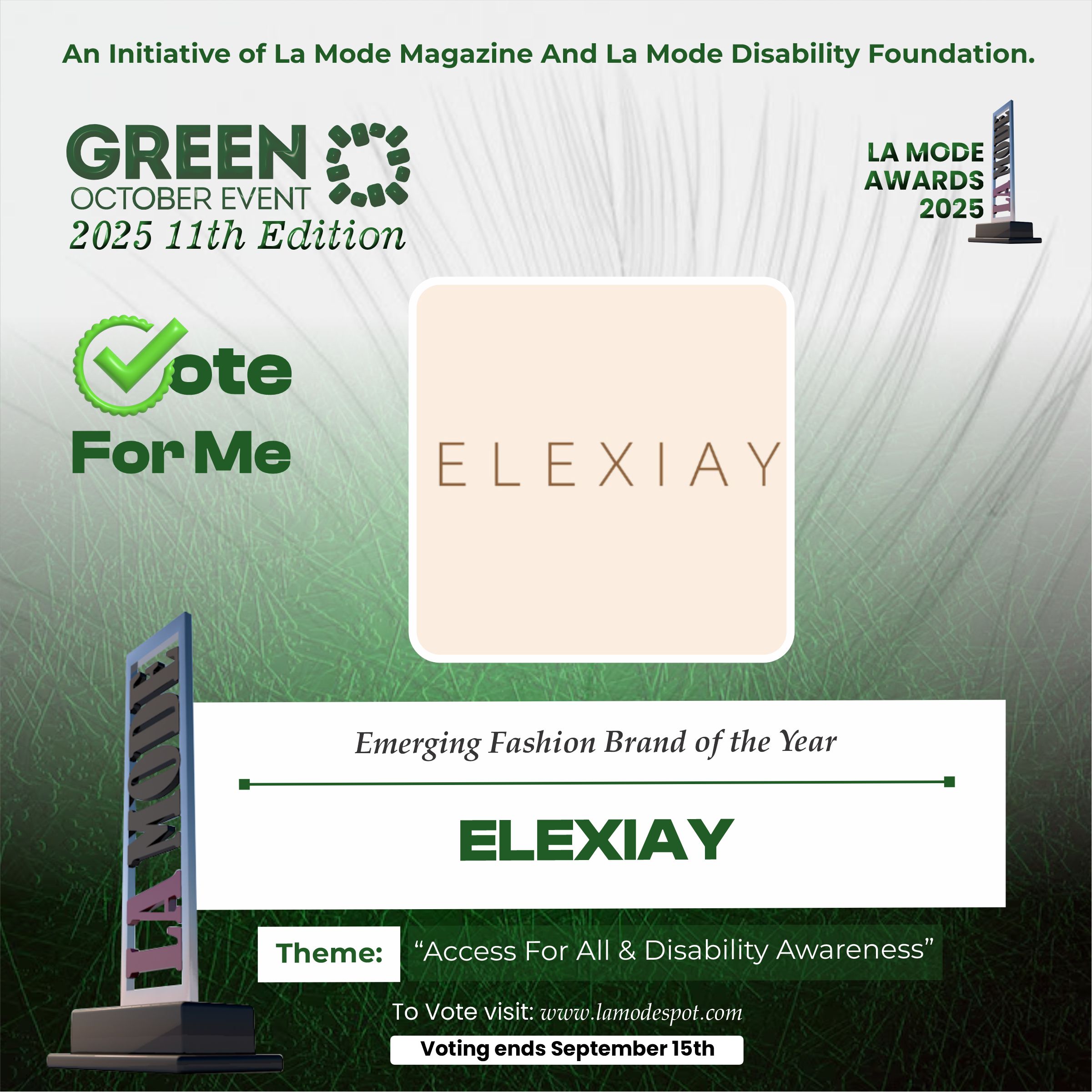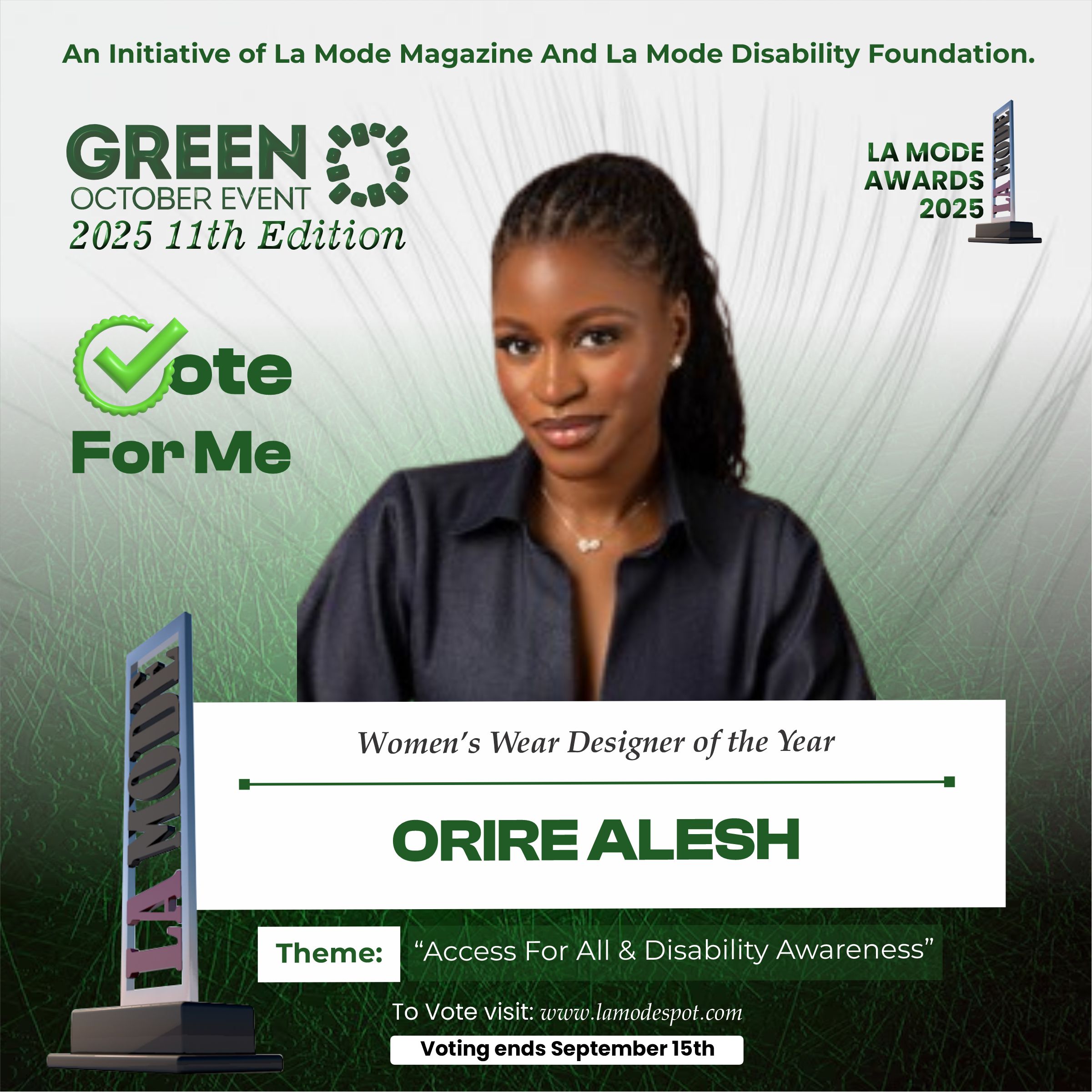 Please note funds generated from the voting process goes to La Mode Magazine Disability Foundation and for Disability Awareness Drive.