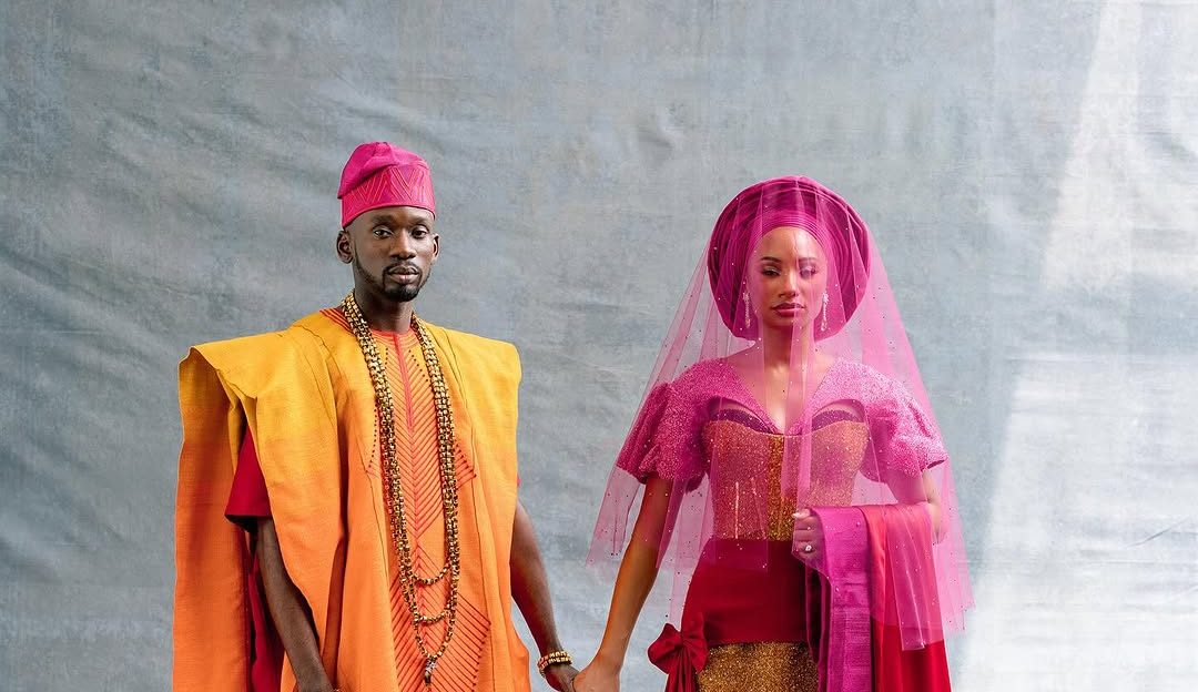 Beside her, Mr Eazi played his part in quiet contrast. His aso oke flowed from soft golden hues into richer reds and pinks, a colour gradient subtle yet intentional, dotted with crystals that caught the light when he moved. Minimal, yes. But also the kind of minimalism that carries weight — a whisper that lingers longer than a shout.