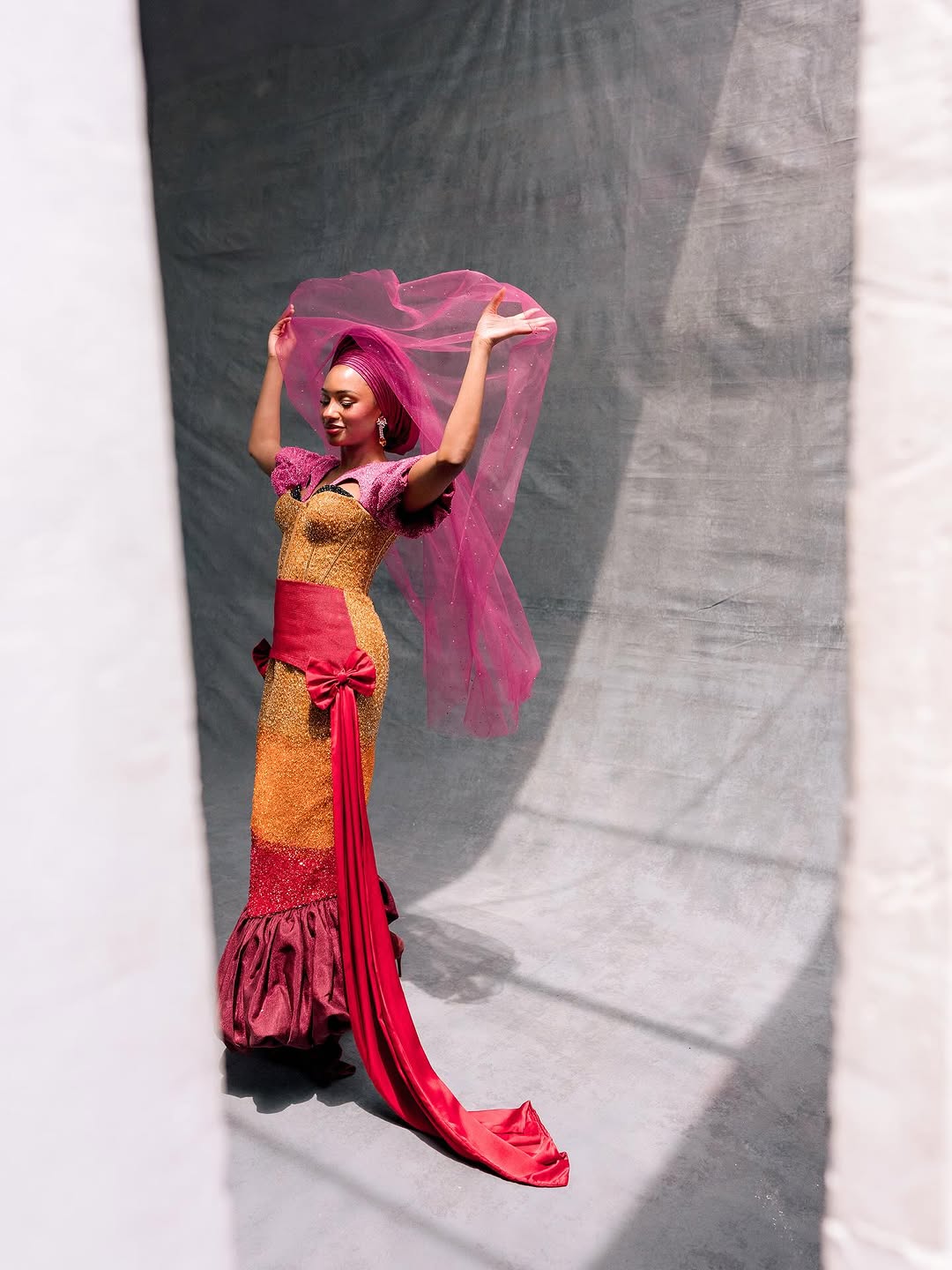 The brief was deceptively simple: sunset. But Folawiyo doesn’t do literal. She does layered. She does memory. She does art. What came down the aisle wasn’t just a gown — it was history wrapped in colour, culture pressed into seams, and emotion rendered in embellishment.