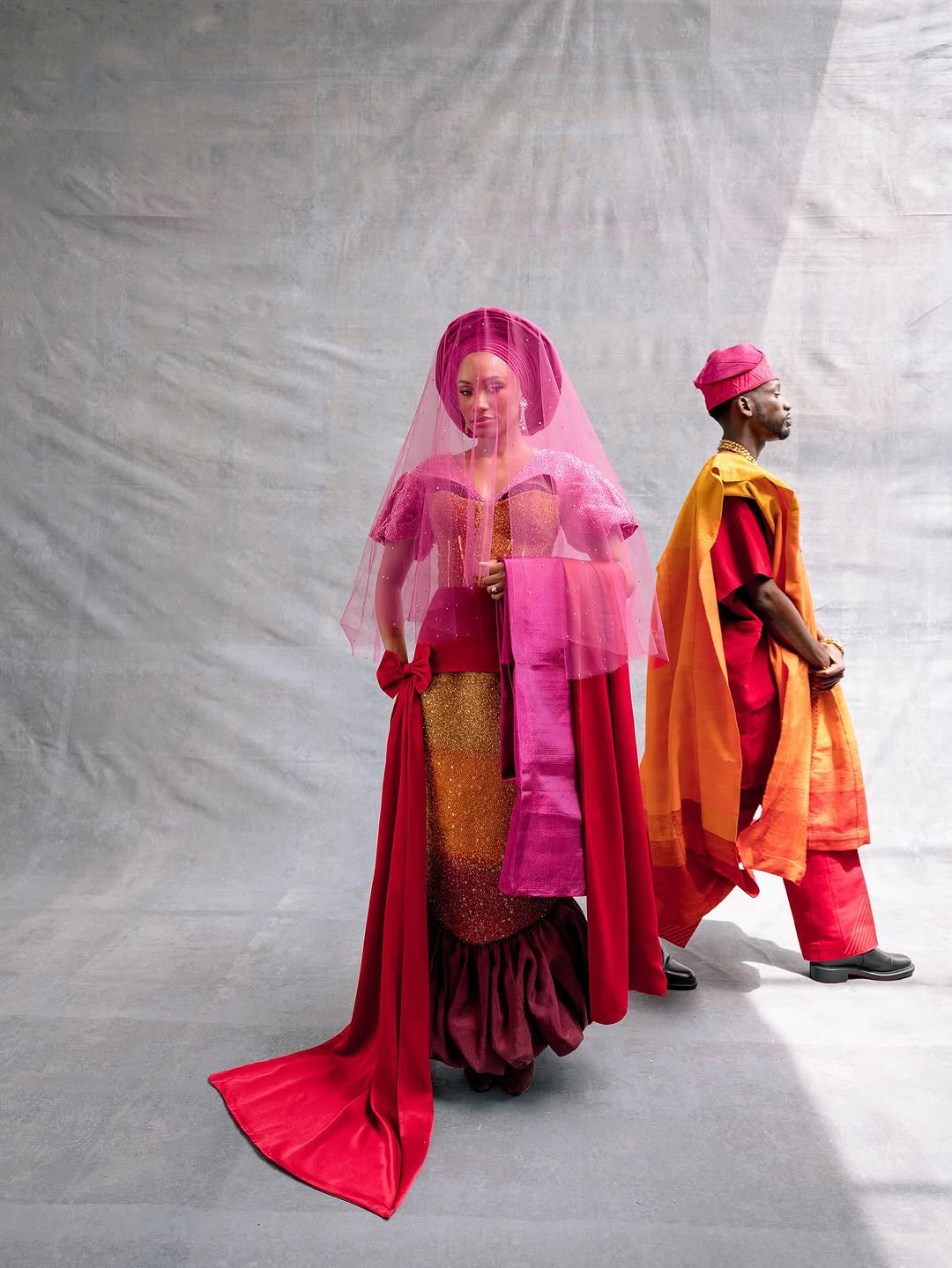 Together, they weren’t just bride and groom. They were a living, moving sunset on Yoruba land — layered, glowing, warm with meaning.