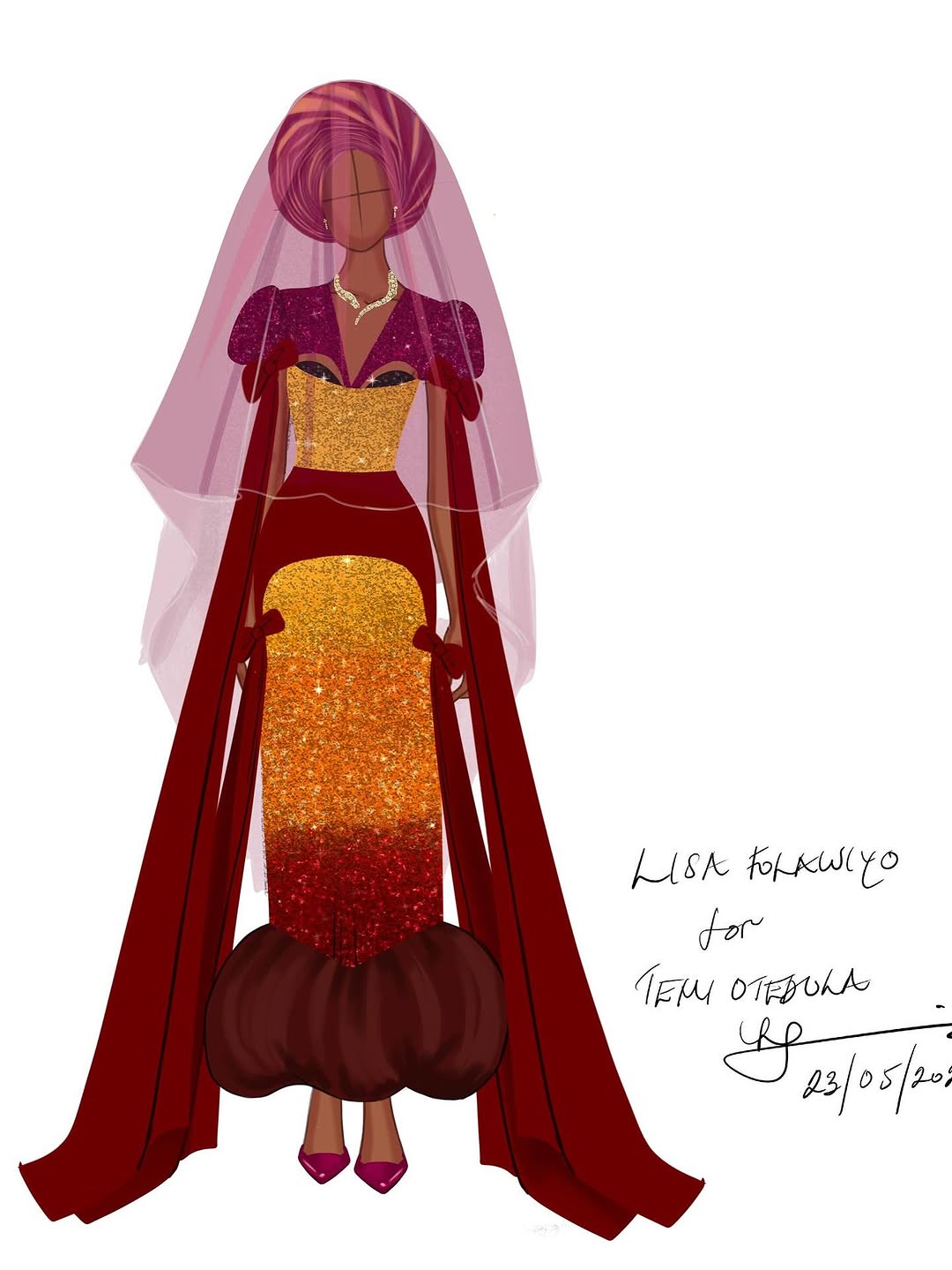 You know that moment when Lagos skies decide to show off — orange dripping into red, pink catching the edges, a streak of gold somewhere in between? Well, Lisa Folawiyo took that exact scene and stitched it into fashion. For Temi Otedola and Mr Eazi’s traditional wedding, she created not one but two looks, and the second? Let’s just say it was less “outfit” and more “love letter to the Yoruba sun.”