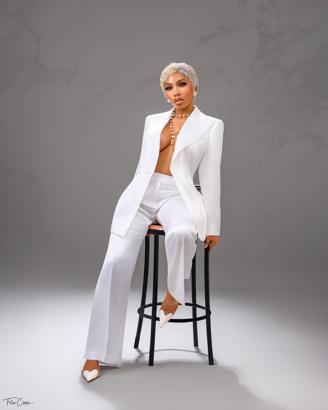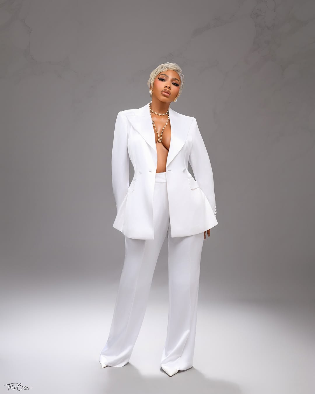 For her birthday, Mercy Eke skipped the sequins and gowns you might expect and instead showed up in full tailoring power. Think crisp, all-white suit: an oversized blazer with sharp shoulders worn open for a relaxed yet commanding silhouette, paired with wide-leg trousers that skimmed the floor like they owned the space. Pearls draped around her neck added that timeless polish, while a platinum blonde pixie cut gave the entire ensemble a futuristic snap.