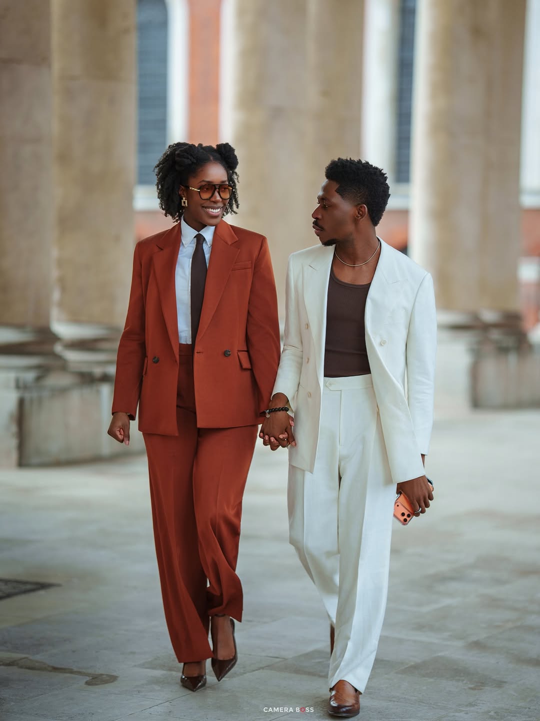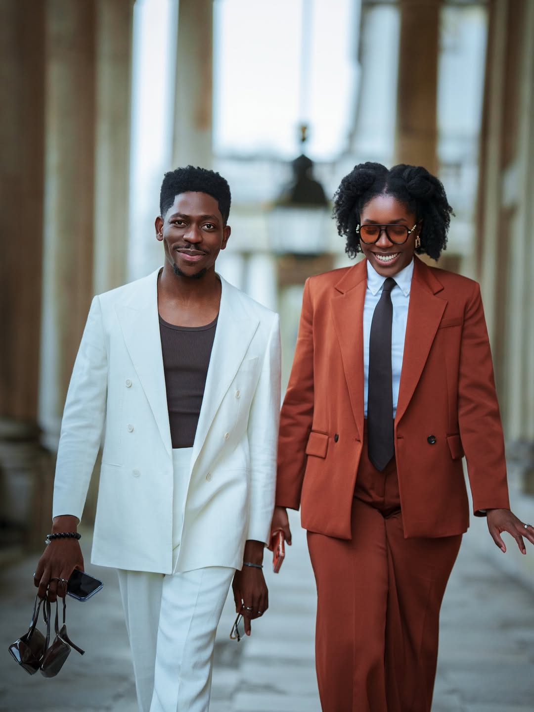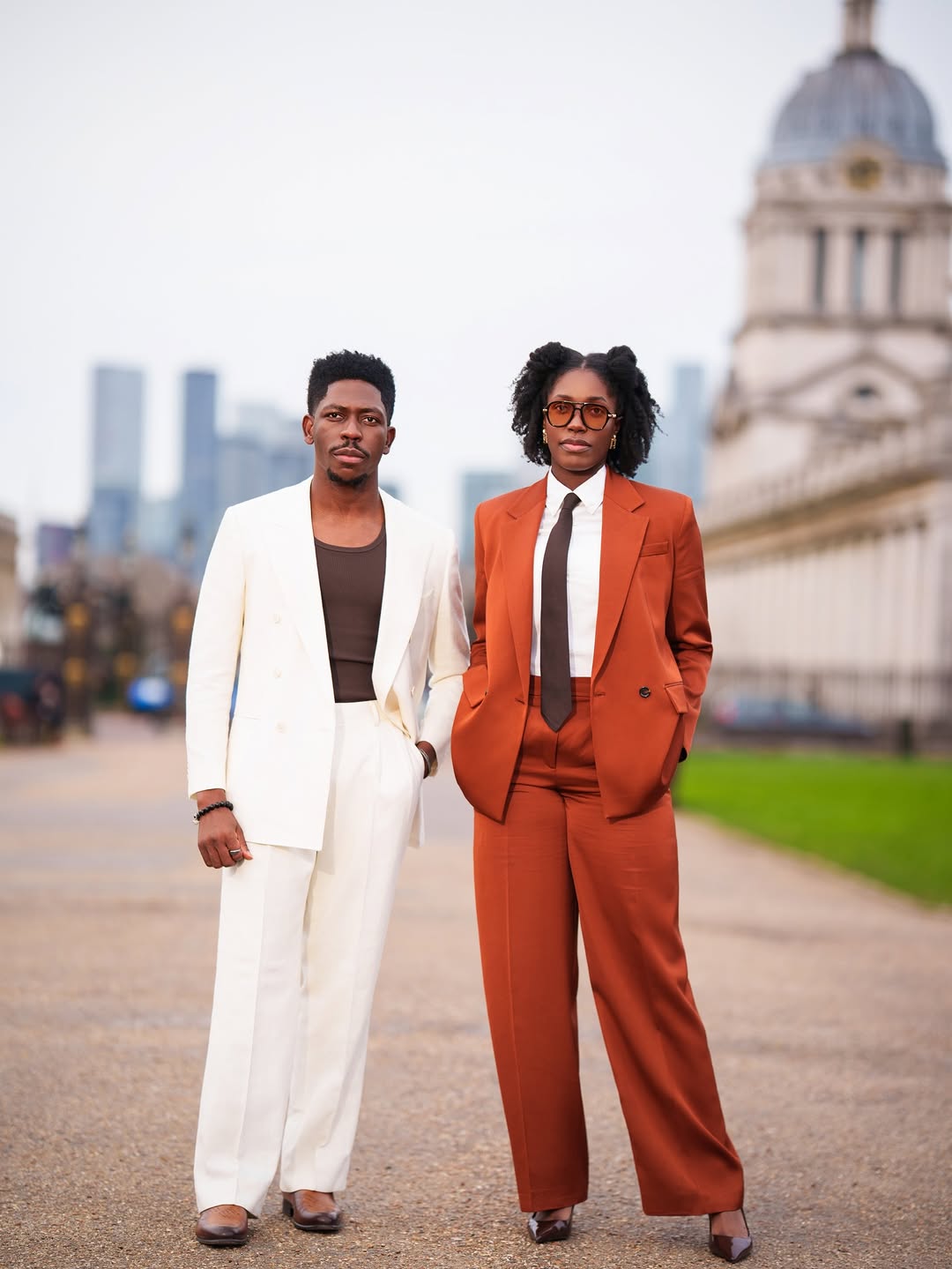 Standing beside him, Marie delivered a complementary yet distinct statement in a rust-orange double-breasted suit. The blazer and wide-leg trousers, cut in the same silhouette as Moses’ look, were styled over a crisp white dress shirt and finished with a dark chocolate brown tie knotted neatly at the collar. Amber-tinted rectangular glasses, delicate gold earrings and dark brown block-heel shoes sharpened the aesthetic, while her hair styled in two high puffs softened the structured tailoring with a playful touch.