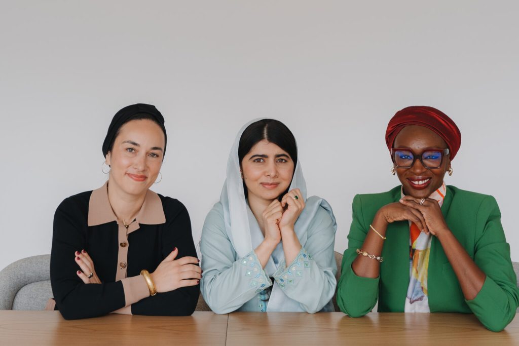 From left to right: Outgoing CEO Lena Alfi, Co-founder Malala Yousafzai, and incoming CEO Nabila Aguele seated together at a table.