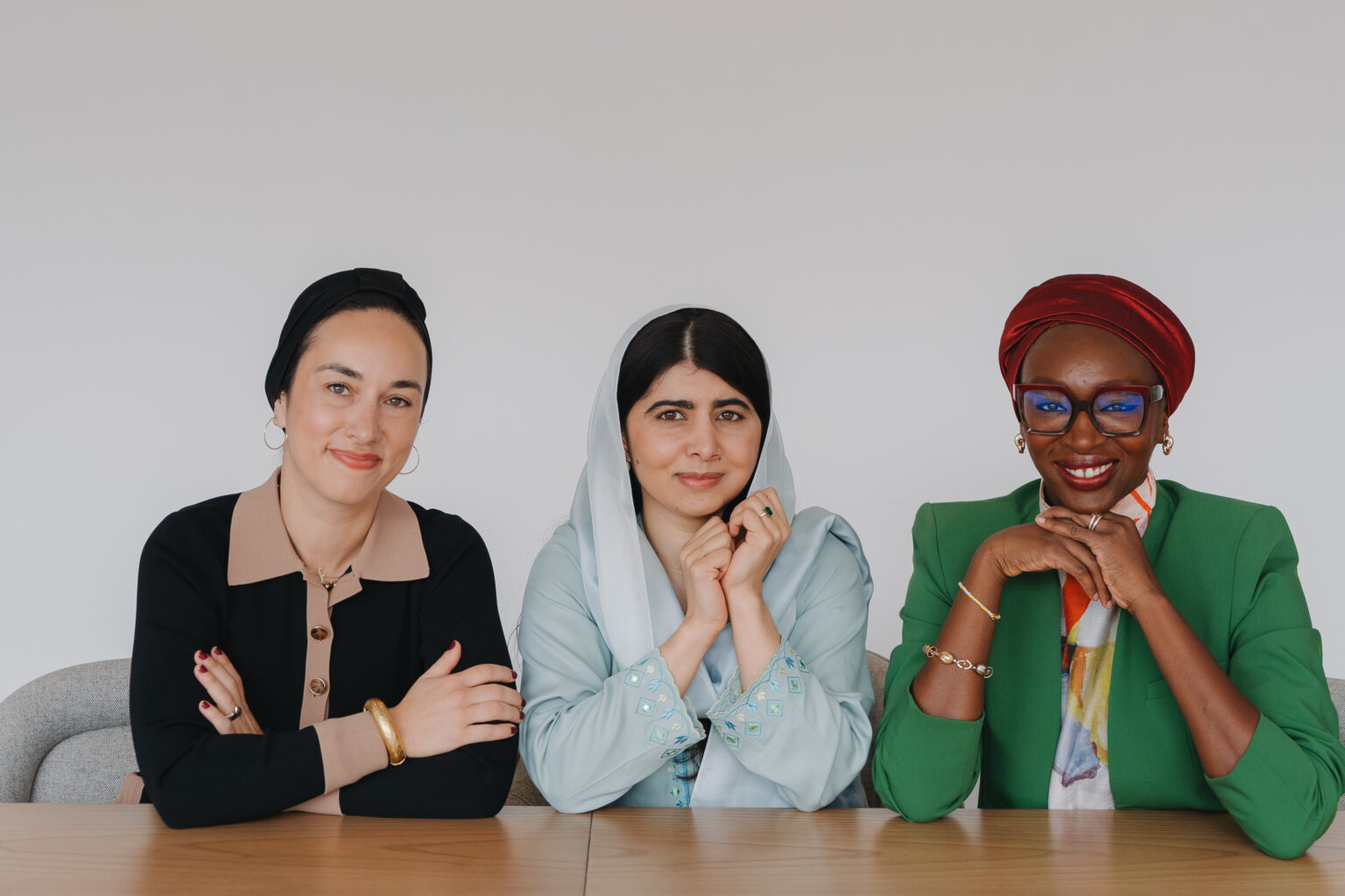 From left to right: Outgoing CEO Lena Alfi, Co-founder Malala Yousafzai, and incoming CEO Nabila Aguele seated together at a table.