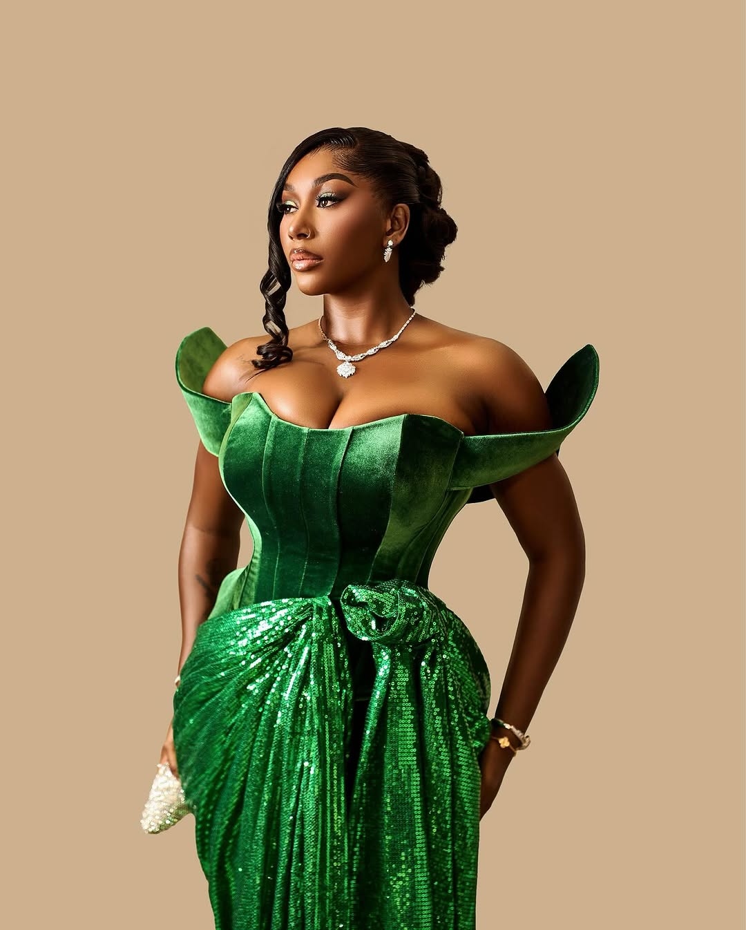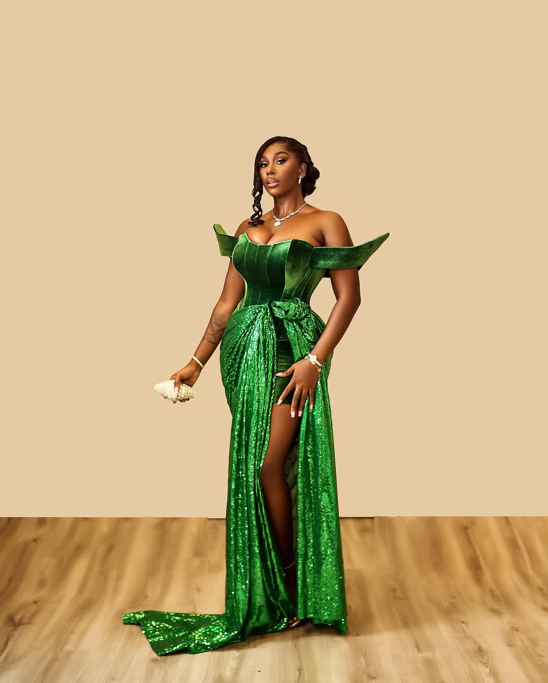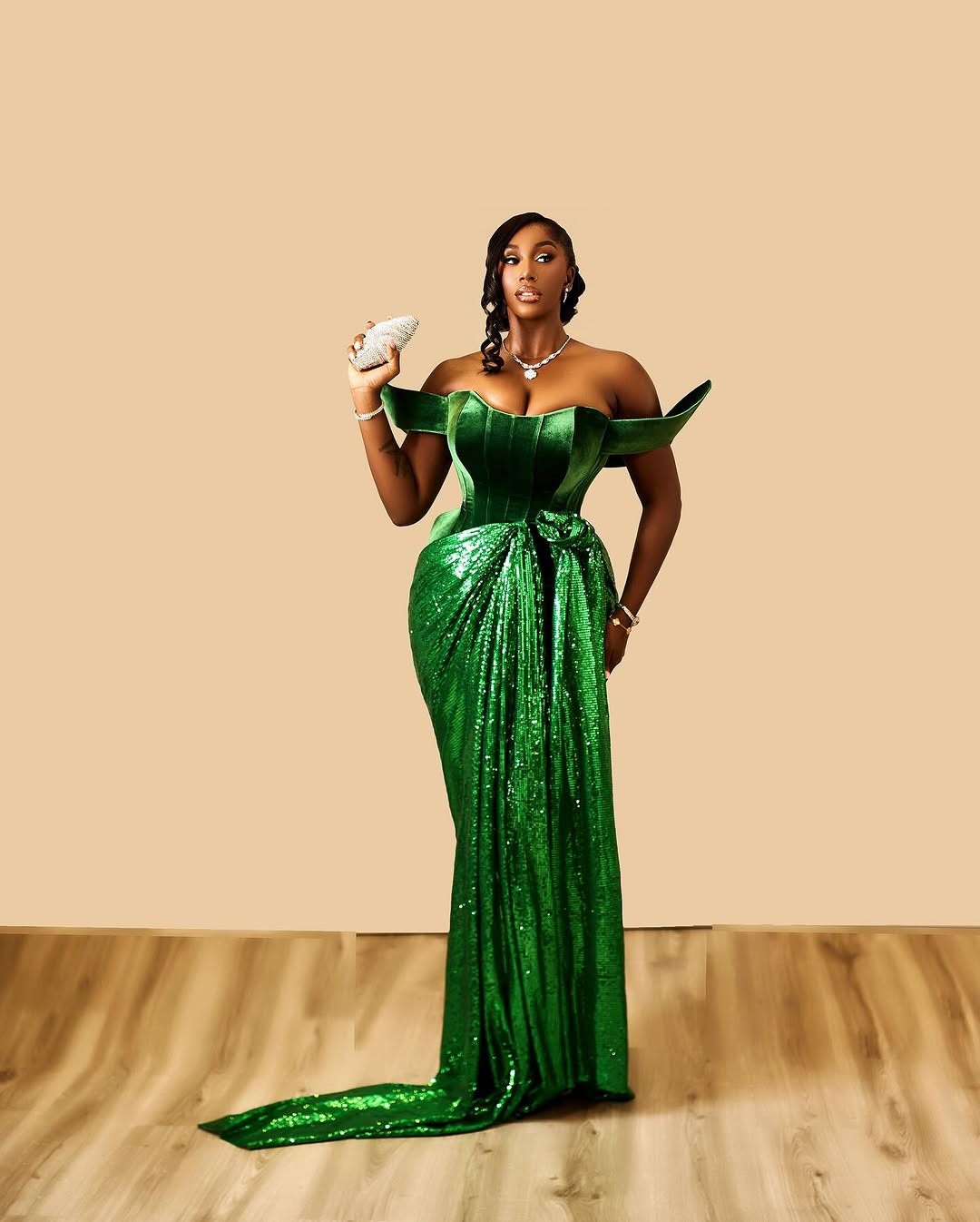 Styled by Prudent Gabriel Peterson, this emerald-green stunner was less “outfit” and more “architectural installation with sequins.” Picture it: a sculpted off-shoulder neckline sharp enough to double as modern art, plus a draped sequin finish that slithered behind her like a glamorous plus-one who refuses to leave the party. The vibe? Somewhere between mermaid-core seductress and Golden Age Hollywood diva—if said diva suddenly decided Lagos was her playground.