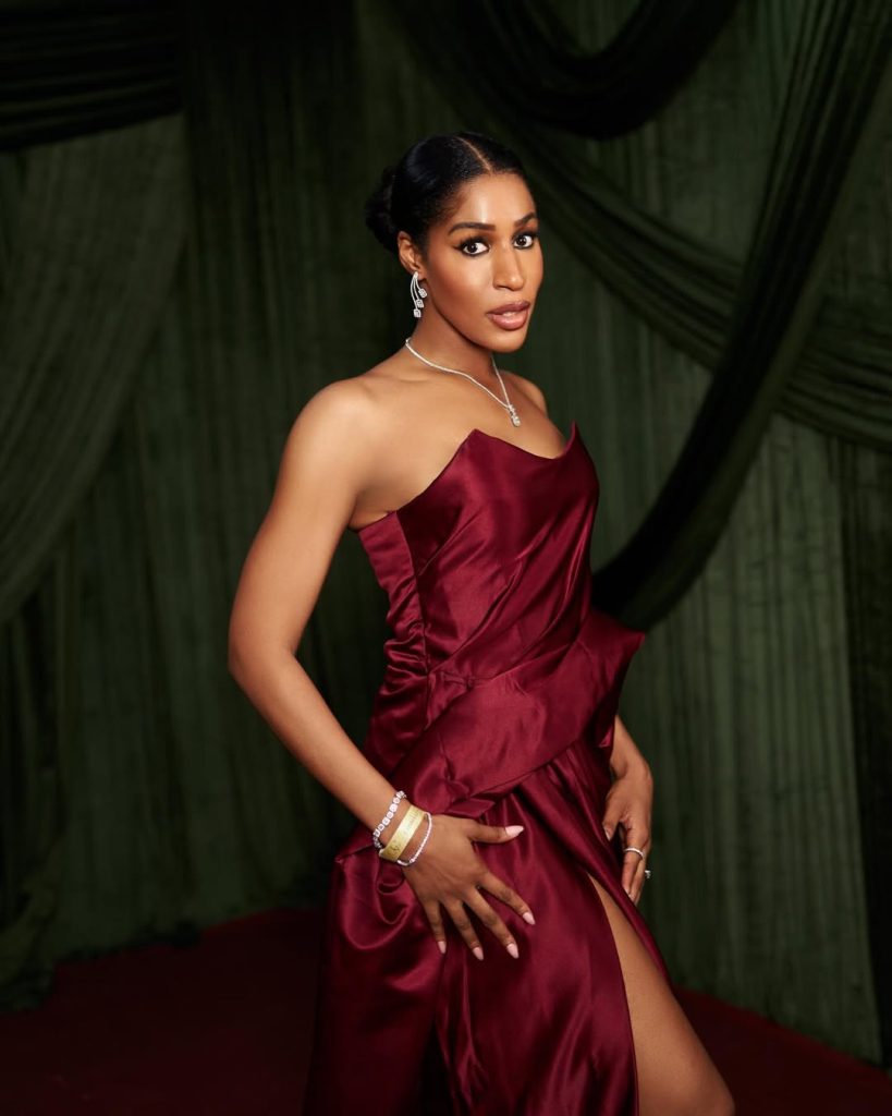 Nicole, of course, held her own. She arrived in a deep burgundy satin gown that balanced structure and fluidity with ease. The strapless sweetheart neckline flowed into a sculptural knot detail at the hip, opening into a thigh-high slit and trailing into a soft train. Styled with crystal sandals and layered diamond and gold jewelry, she completed the look with a sleek low bun and matching deep red nails, polished, confident, and undeniably chic.