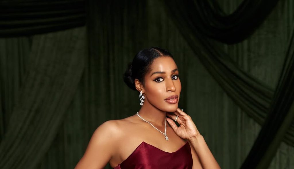 Nicole Chikwe attends her mother’s 70th birthday celebration wearing a draped burgundy satin gown. Photo Credit: Nicole Chikwe/Instagram