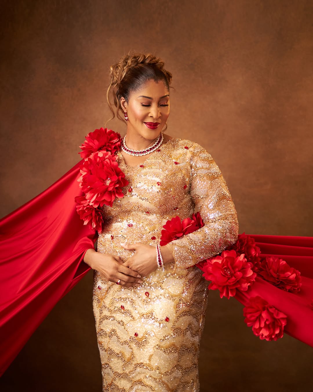 Styled by Sorena Bridal, the celebrant marks her 70th birthday in a custom champagne gold gown with wave-patterned sequins and a regal crimson cape adorned with three-dimensional blooms. Photo Credit: Sorena Bridal/Instagram