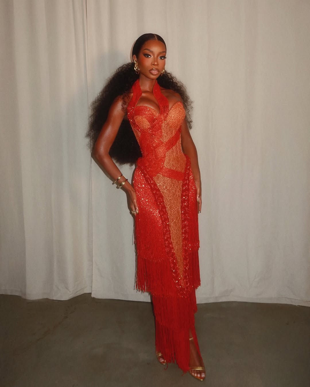 Model and reality television personality Olandria delivered one of the night’s standout moments in a striking orange gown by House of Marvee. The silhouette balanced elegance with bold visual impact, proving once again how statement colour, when executed with precision, can command immediate attention on the red carpet.