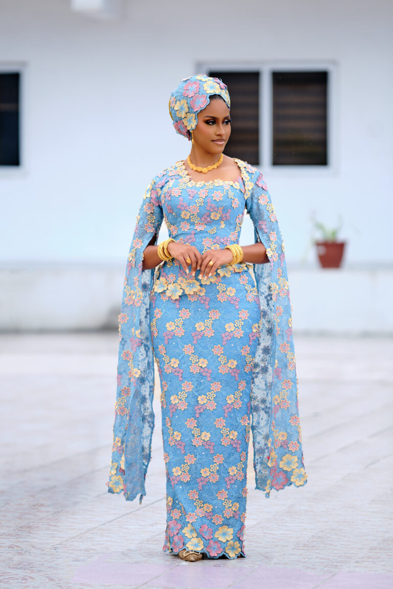 This Northern bridal (bride) look by Oprah’s Cut is proof that elegance doesn’t need to shout; it simply glows. The sky-blue lace dress is sprinkled with soft pink and yellow floral embroidery, giving a romantic contrast that feels both traditional and forward-thinking. But what really takes this look to bridal legend status? Those dramatic cape sleeves — bold, sweeping, and unapologetically main character energy.