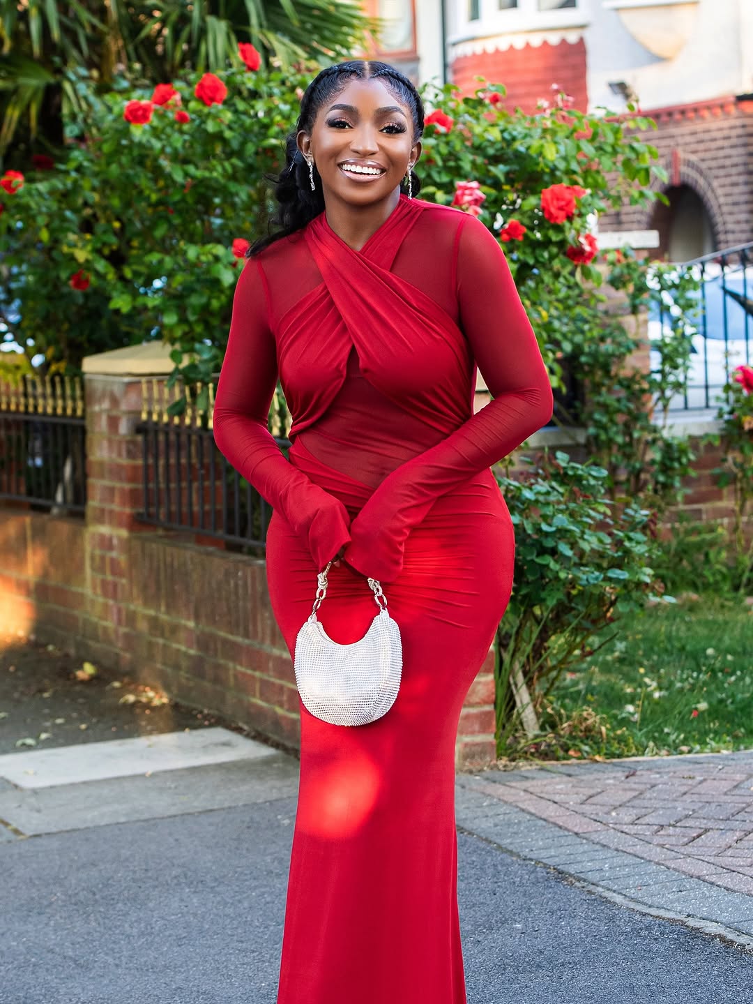 The floor-length dress? A perfect storm of sheer long sleeves, ruched drama at the waist, and that cheeky mesh panel at the midriff that said, “I’m classy, but I still know how to play.” It hugged her like it had a personal vendetta against baggy fits.