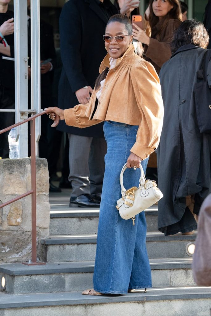 Oprah carried the iconic Chloé Paddington satchel in rich brown leather, complete with its signature rivets, flap closure, and oversized lock hardware. The piece didn’t just complement the outfit, it elevated it, adding texture, history, and a sense of quiet luxury.