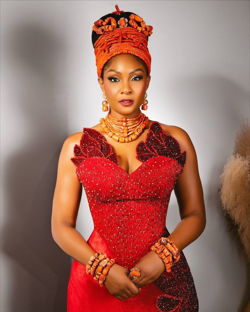 But the real statement? The traditional Edo headpiece, delicately stacked with coral beads — a crown in its own right. Osas paired it with multiple layers of coral necklaces and bracelets that echoed her roots with quiet authority. Even her beauty look told the same story: warm golden tones, soft bronze lids, and a mauve lip that tied it all together like the final brushstroke on a masterpiece.