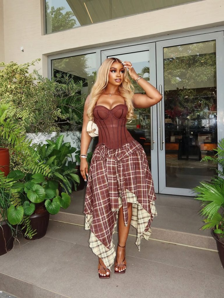 The contrast came through in the skirt. Opting for volume and movement, Priscilla Mkambala wore a multi-tonal plaid piece that shifted the look into something more expressive. Designed with a tied-waist detail reminiscent of a casually wrapped flannel, the skirt was elevated through its asymmetrical, handkerchief hemline. The interplay of mahogany and cream tones bridged the deeper hues of the corset with the lighter elements of the overall styling.