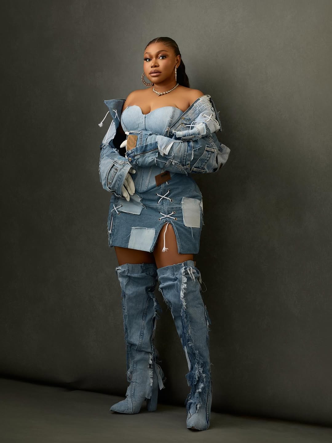 The first look, worn for her March 24 birthday, reimagines denim through a high-fashion lens. Built around upcycled materials, the outfit features a structured corset with visible boning layered beneath a cropped, oversized patchwork jacket. Frayed edges, lace-up details, and an asymmetric mini skirt bring texture and attitude, while thigh-high denim boots and a matching duffle bag complete the look with a cohesive, statement finish.