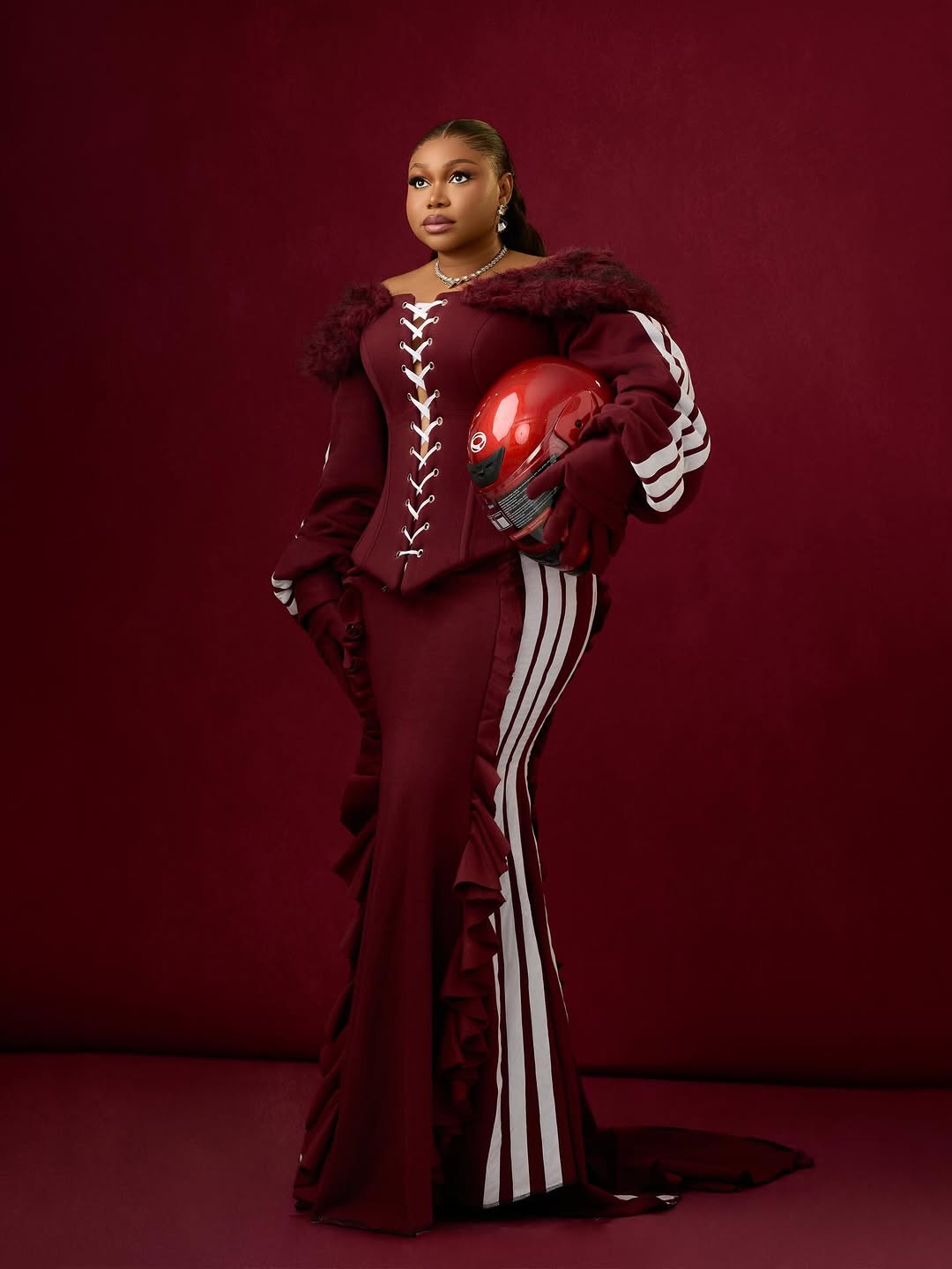 For April, Ruth Kadiri pivots into a more polished, concept-driven direction. The deep burgundy two-piece set blends structure with a sporty edge, a fitted corset top paired with a skirt that hugs the hips before softening into ruffled movement. An off-shoulder neckline, framed by voluminous textured trim, adds drama, while bold white racing stripes introduce an athletic contrast.
