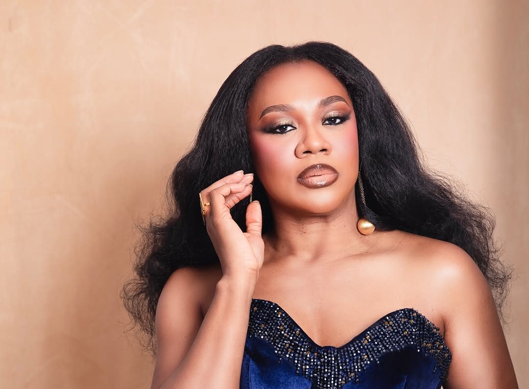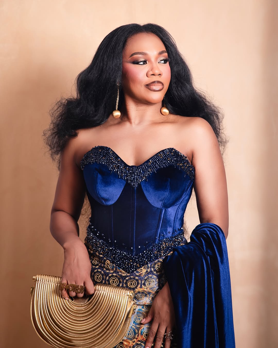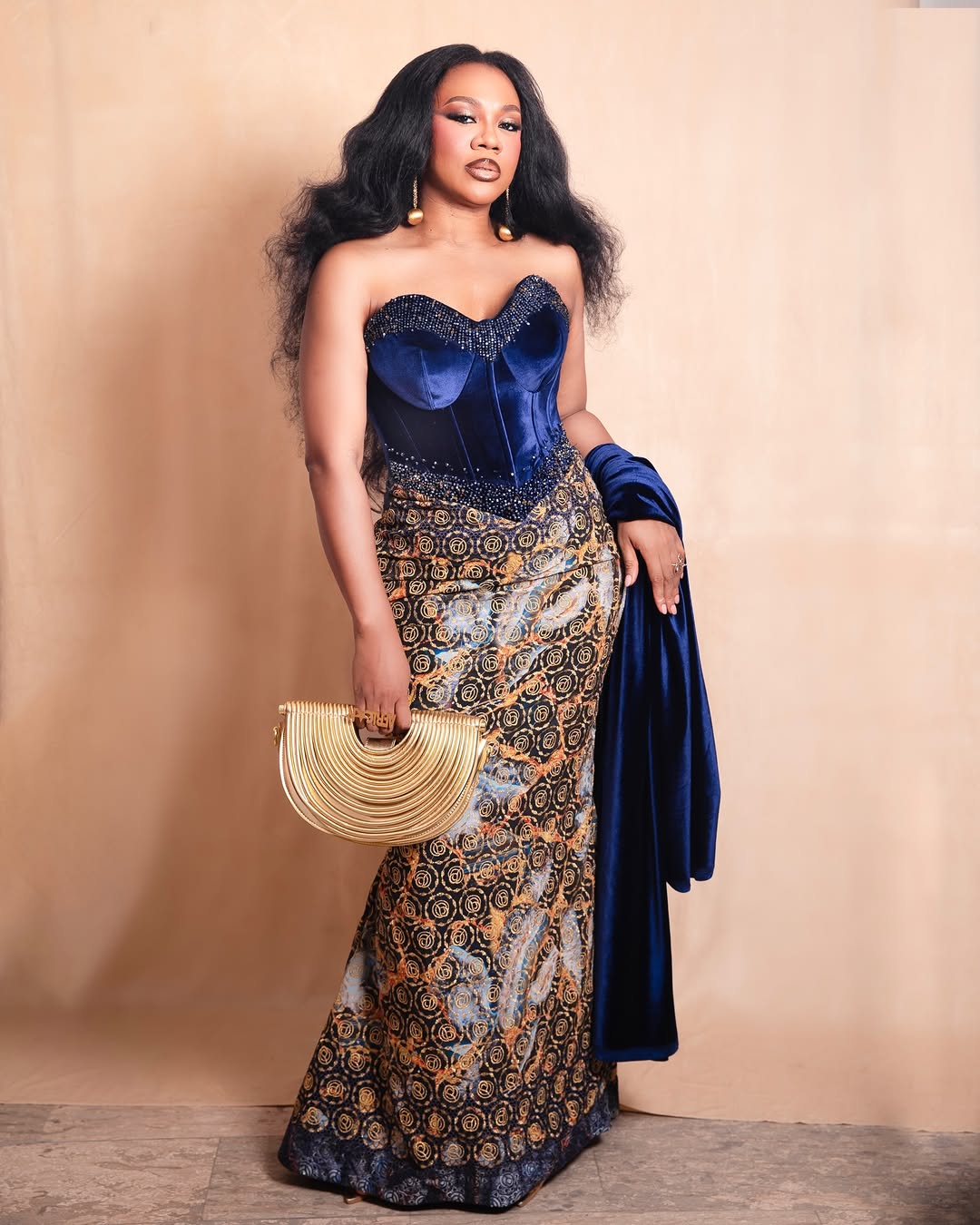 Stella Damasus posing in a beaded midnight blue velvet corset and a gold patterned floor-length skirt while holding a gold clutch. Photo Credit: Stella Damasus/Instagram
