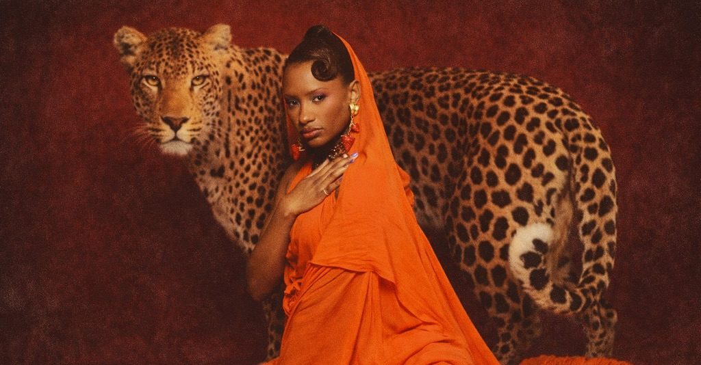 And then there is the setting. One image, in particular, does all the work: Temi seated against a deep burgundy backdrop, draped in orange, with a leopard positioned behind her. The contrast of colour, texture, and mood transforms what could have been a simple birthday shoot into something far more editorial. (And yes, before the questions start, the leopard isn’t real, but it plays its role convincingly.)