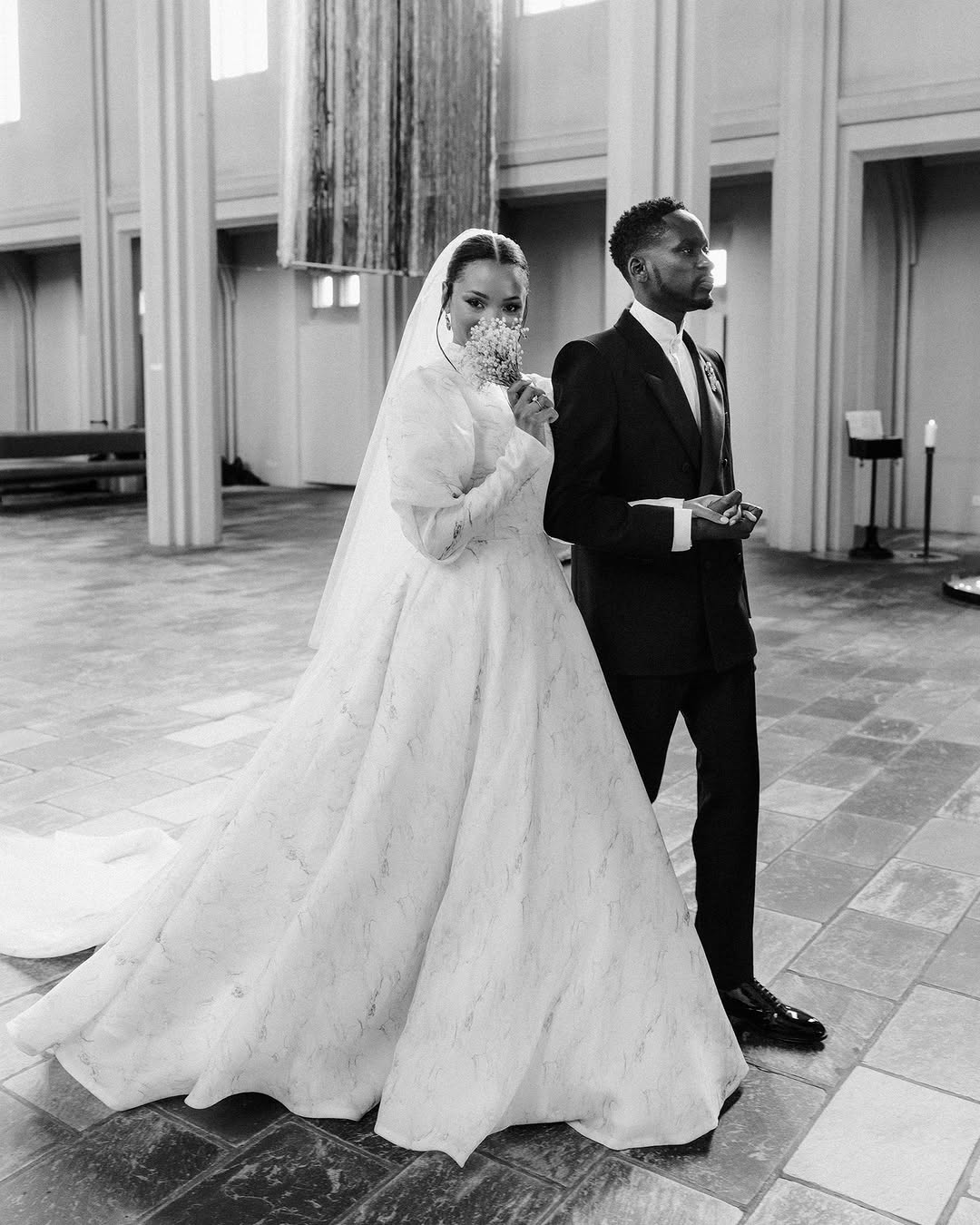 After countless couture changes and stunning cultural moments, Temi saved her boldest card for last. At Hallgrimskirkja church in Reykjavik, she floated down the aisle in a marble-swirled Fendi Haute Couture gown — her self-described “dream dress.” The inspiration? None other than Audrey Hepburn’s 1954 bridal look. Timeless. Regal. Cinematic.