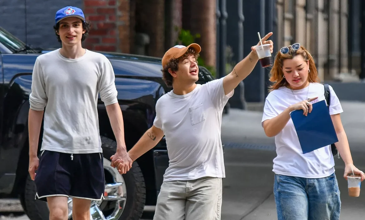 Wolfhard kept it casual and comfy in a long-sleeved tee with rolled-up sleeves and athletic shorts. Matarazzo sported a laid-back look with grayish-beige barrel jeans, a white T-shirt, matching sneakers, and a burnt orange baseball cap. Yu complemented the boys’ style with a white T-shirt, light-wash blue jeans, black and white sneakers, round sunglasses, and a chic black baguette purse.