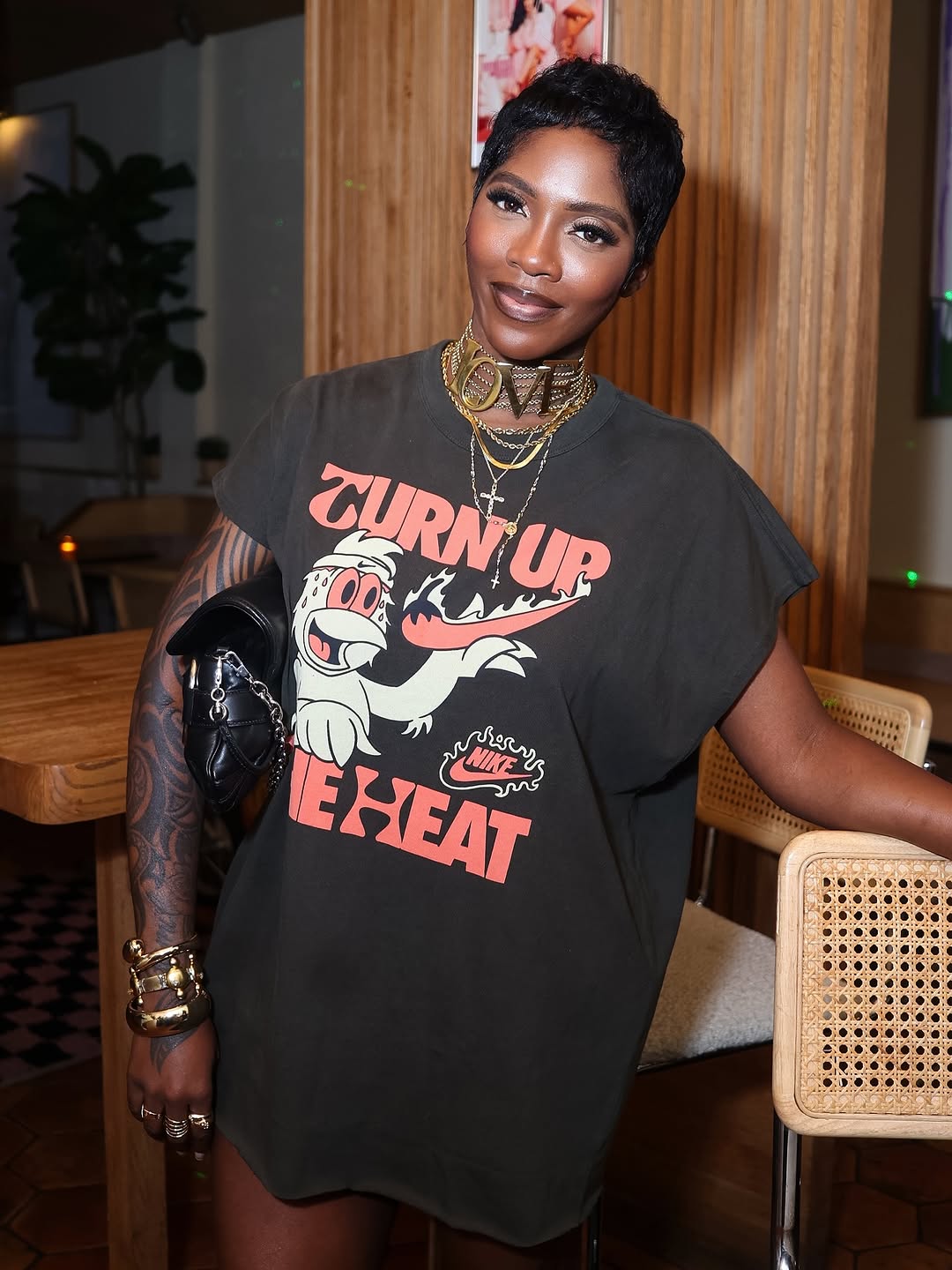 Tiwa kept her look effortlessly cool — short dark hair, sleek and sharp, framing her face with just the right amount of edge. Her black graphic tee (bold text, playful cartoon imagery) proved that sometimes low-key fashion hits harder than full glam. Add in those layered gold chain necklaces, and you have an outfit that says “star” without even trying.