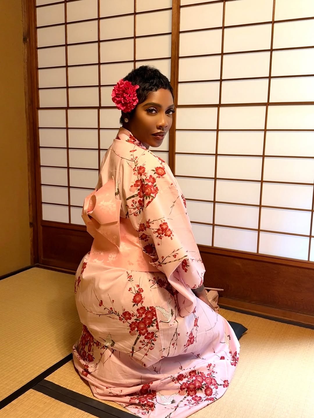 The vibe? Culture meets couture. One minute she’s strolling streets lined with neon and lanterns, the next she’s perched on tatami mats in full kimono glory. And not just any kimono—this one’s pale pink silk scattered with cherry blossoms, wide sleeves flowing, and a coral obi tied perfectly at the waist. Add a floral fan, a bamboo-handled bag, and a red flower tucked into her low bun, and you’ve got a look straight out of a Japanese art book.