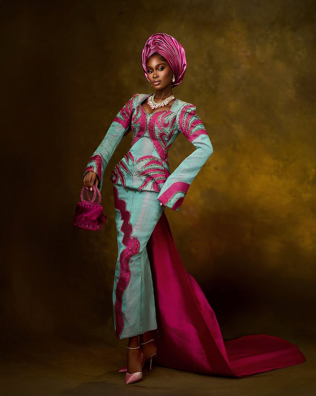 Designed by Designs by Lezie, the look centres on a rich green aso-oke base, accented with soft pink patterns and detailed green beadwork. It’s a colour combination that feels intentional and quietly bold familiar enough to honour tradition, but different enough to stand apart.