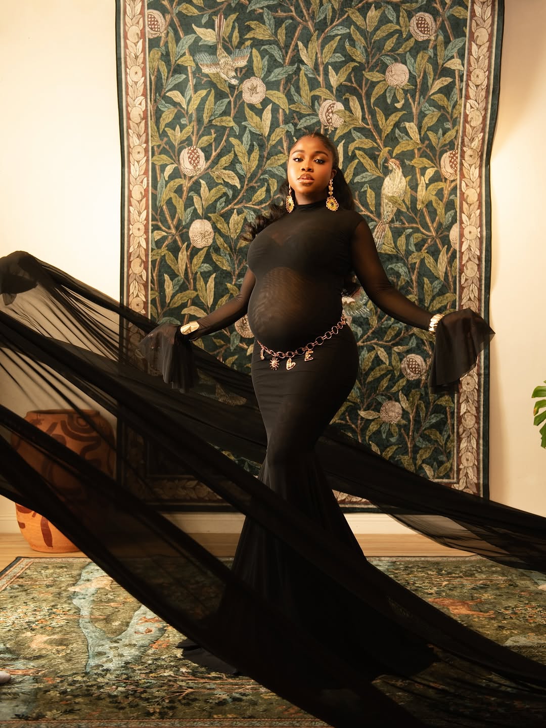 While Veekee is out here embracing maternity fashion in a sheer mesh gown, she is also actively designing Simi Sanya’s second look and reception dress for the #MeetTheDapsons26 traditional wedding — all while working remotely abroad.